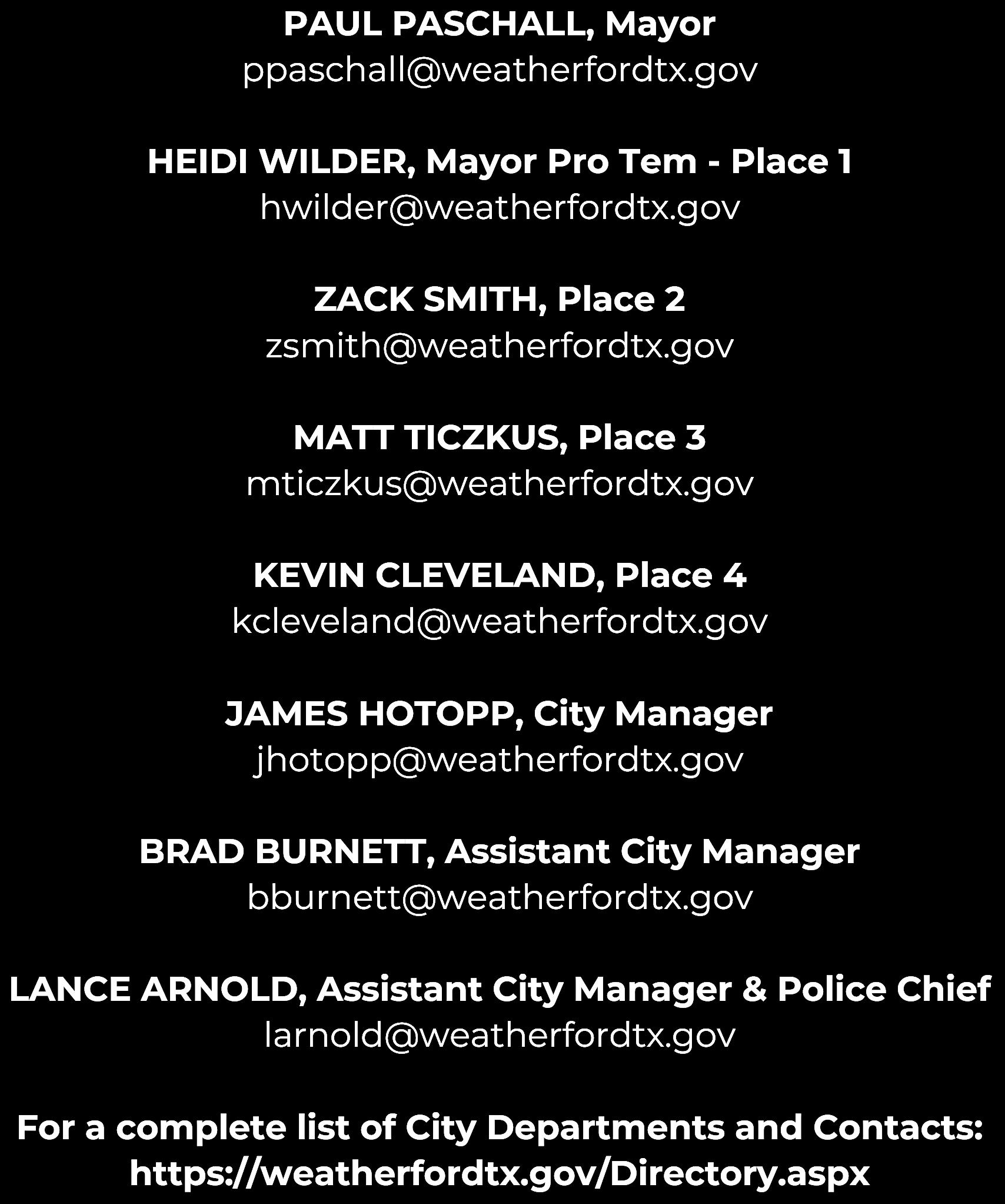 The Weatherford City Council regular meetings are held the second and fourth Tuesdays of each month The public is welcome to attend in person at 303 Palo Pinto, or watch the live stream online
