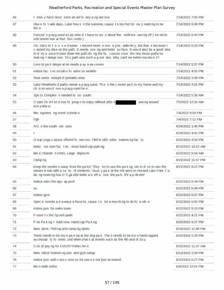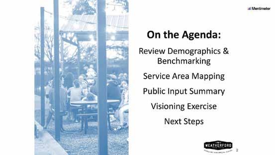 3. A web-based survey – available from spring to fall of 2022 and powered by Survey Monkey – completed by 2,755 respondents (about 9% of the total City of Weatherford population)