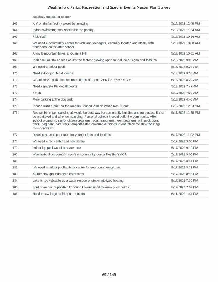 119 We would LOVE to see indoor tennis courts. It’s hard to use the tennis courts at Soldier Springs when the weather is nice, because they’re also in use by the school. We would LOVE a YMCA type indoor center here in Weatherford meant for public use and would even pay a membership to use it 5/17/2022 8:07 PM