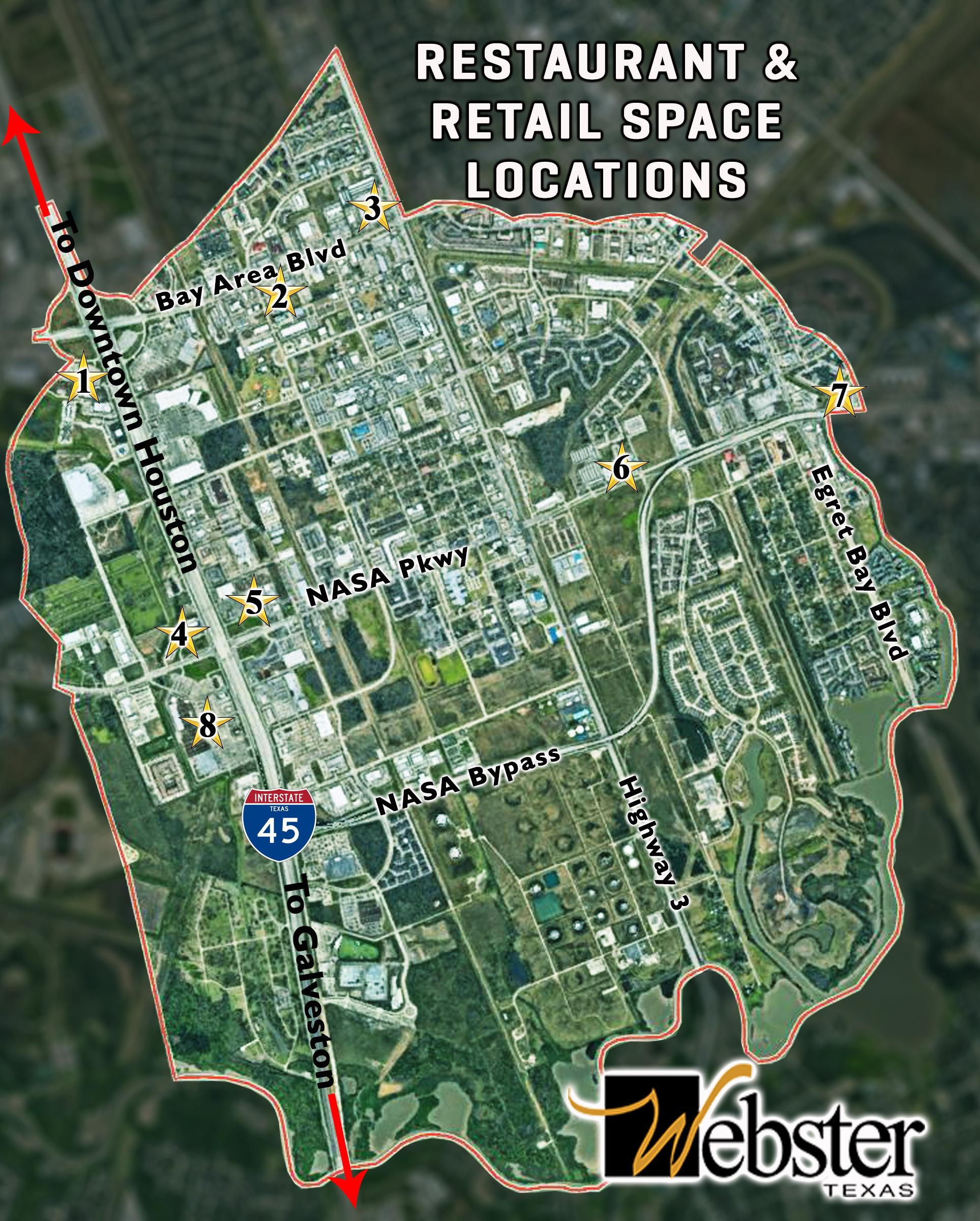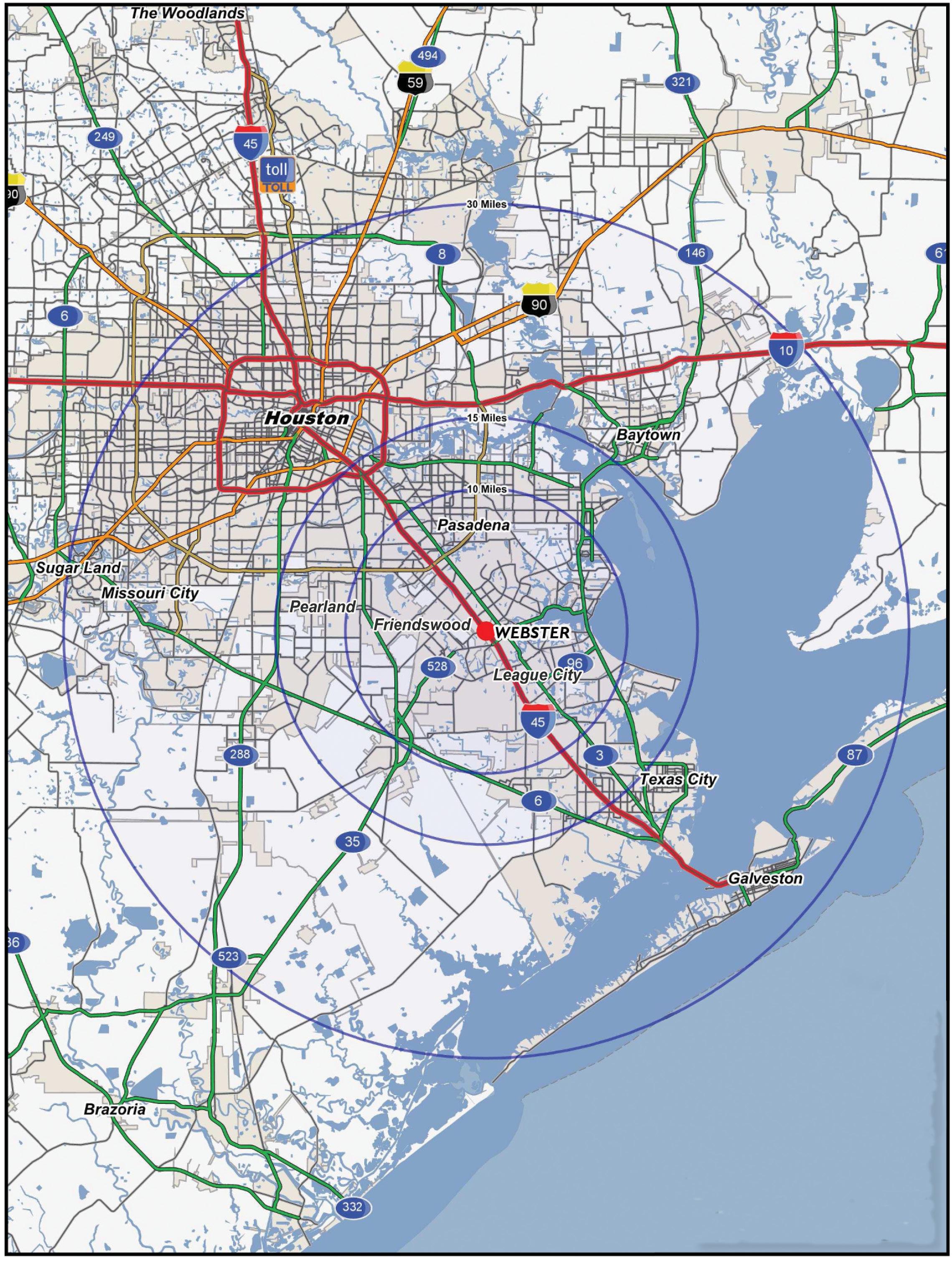 • Major arteries, like I-45, Bay Area Boulevard, NASA Parkway, and Highway 3