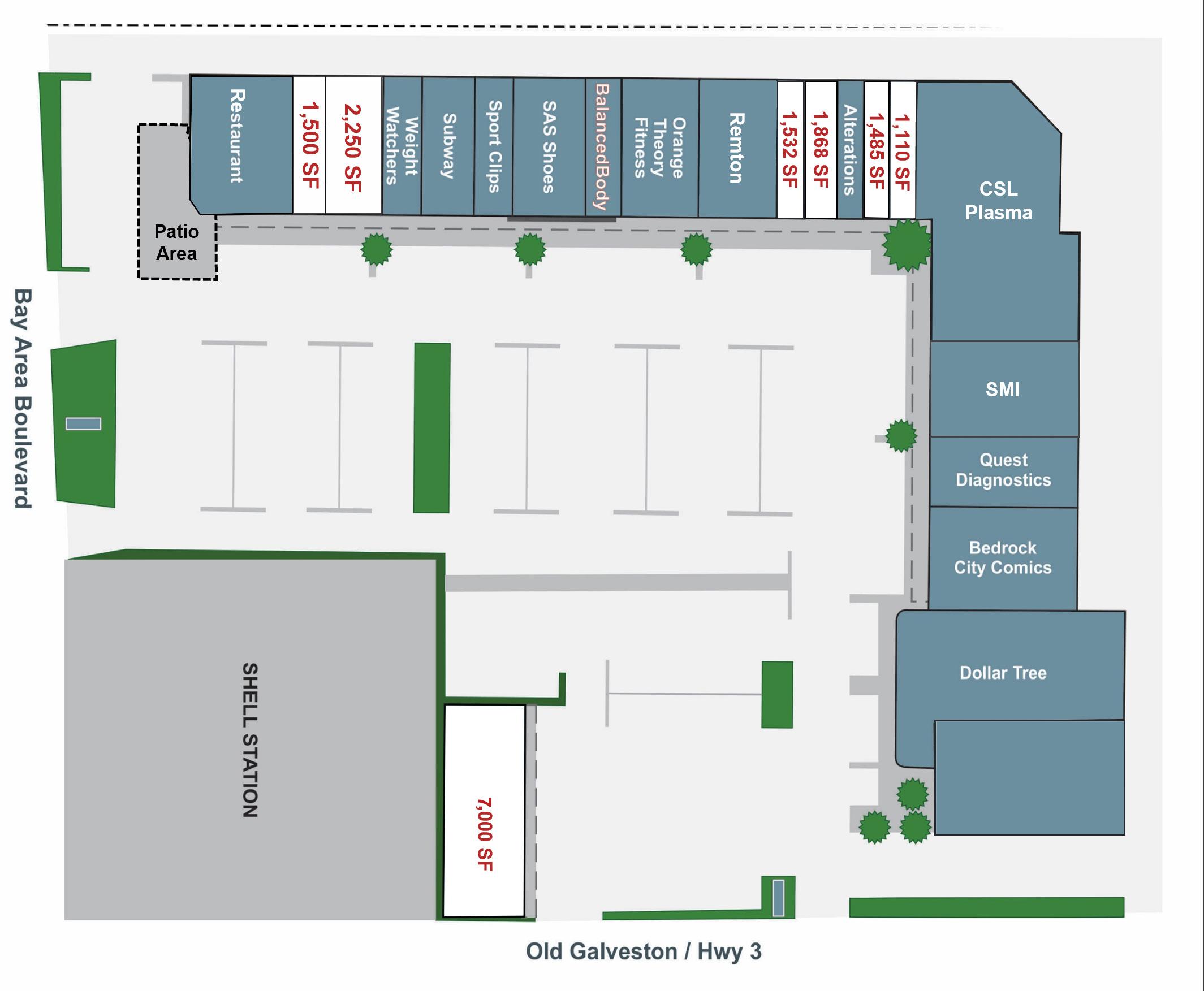 100 West Bay Area Boulevard: The northwest corner of Bay Area Boulevard and Highway 3 features multiple locations ranging from 1,110 SF up to 7,000 S available for lease. Bay Area Square commands superb traffic counts and exposure from both Highway 3 and Bay Area Boulevard and is anchored by Dollar Tree, Orange Theory, Bedrock Comics, and various boutique retailers and healthcare companies.