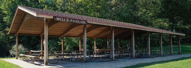 On the banks of Wells Lake, this rustic shelter seats 24 at the picnic tables . The shelter has overhead lighting, electric outlets, and a small grill. Two fishing piers are nearby.