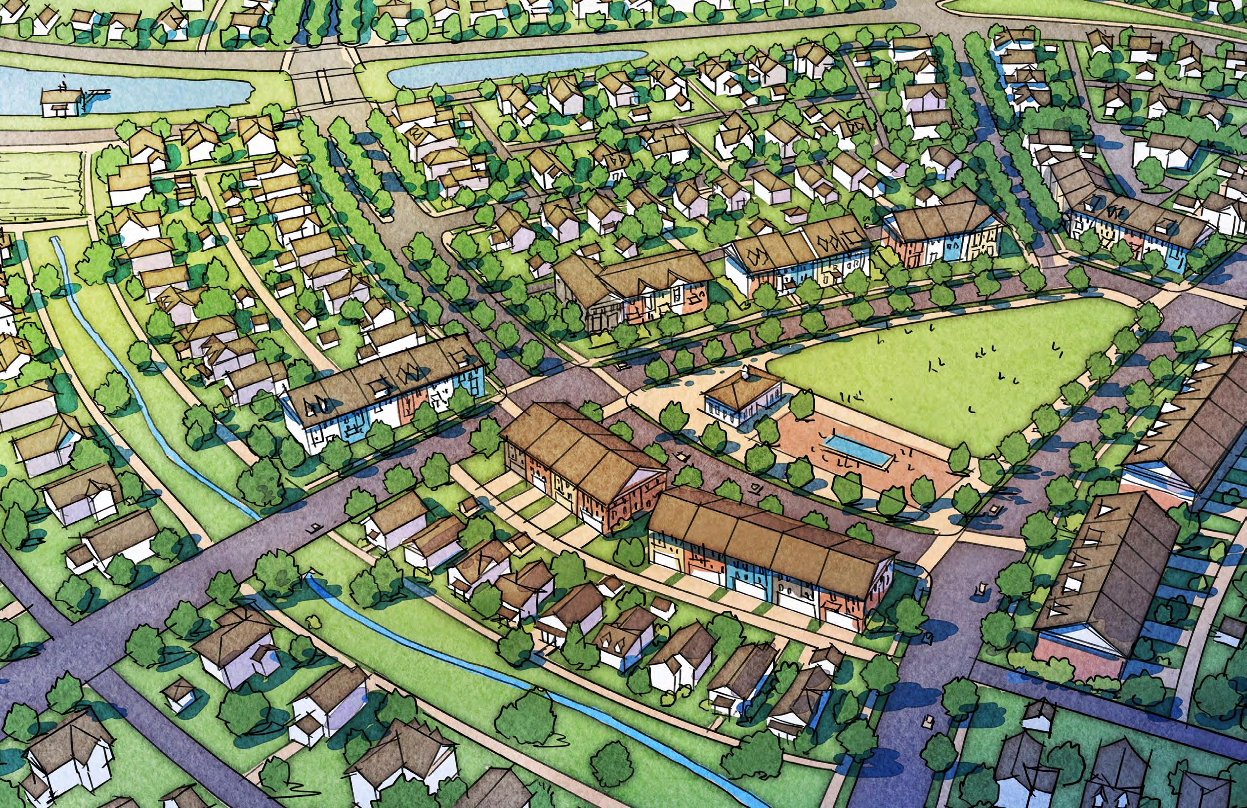 Through the use of urban design, landscape architecture, and civil engineering, the City of West Fargo has the opportunity to greatly advance its existing sustainable stormwater management. This plan shows the use of stormwater capture ponds as an interconnected system of civic spaces designed to collect, temporarily store and treat stormwater runoff. These features could also act as park space with housing facing on them.