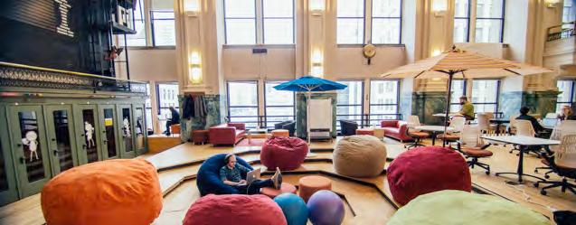 A square or plaza is located within a 5-minute walk of every building, with one outdoor civic space provided in each of the four quadrants of the plan. Some of these spaces could accommodate a soccer field and/or a fitness center to provide for active team recreation and convenient exercise space for workers during breaks.