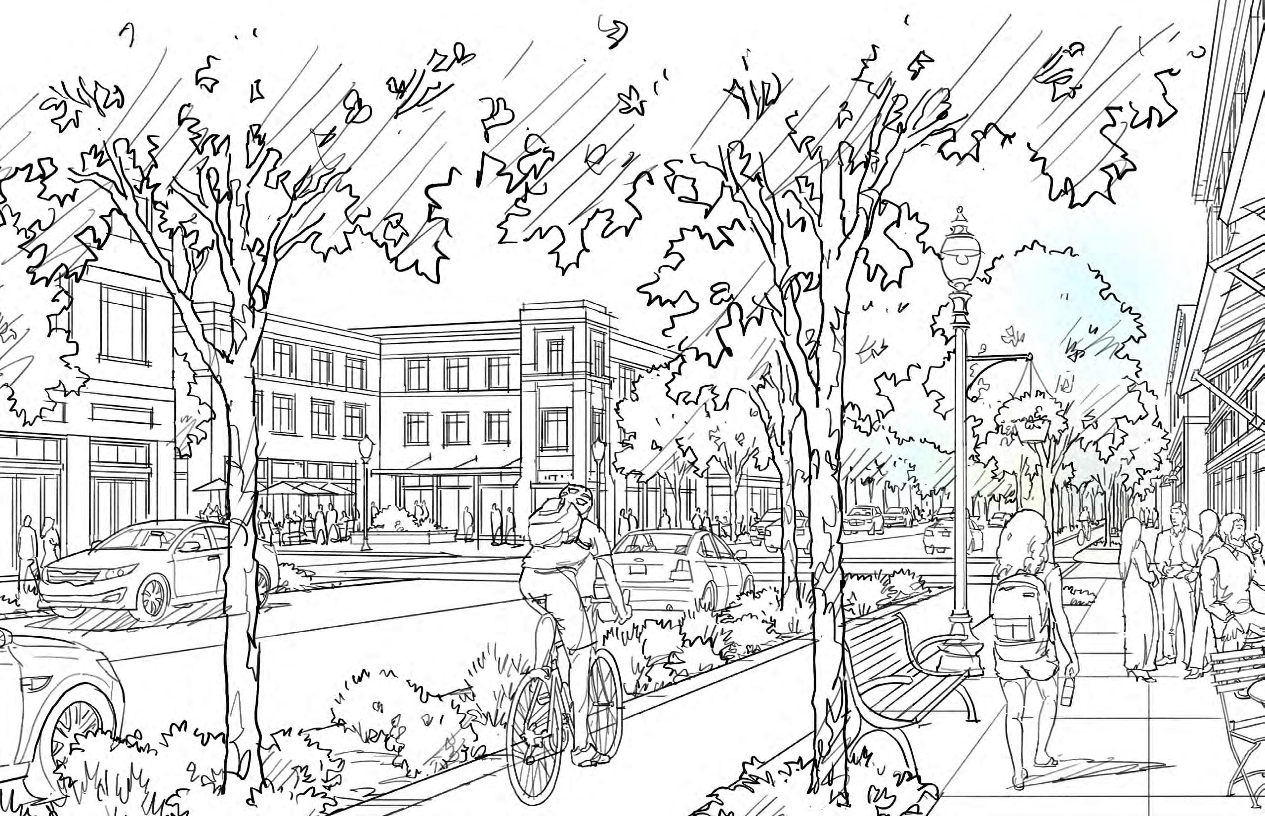 As the main community gathering space for local residents, West Fargo’s downtown could provide a much needed location where people could meet daily or for special occasions. This rendering demonstrates the possibility of the downtown to become just that, creating a mixed-use area where day-to-day services are available, along with office space and some additional housing located above retail. Parking would be provided behind buildings or in a parking garage creating a more walkable and attractive streetscape, while still being easily accessible by car. Wider sidewalks and a separated bike lane would improve the welcoming atmosphere for pedestrians and cyclists alike.