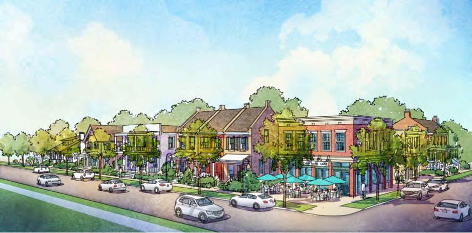 Redevelopment of the area into a mixed-use node, including community-serving commercial uses with parking hidden behind buildings, along with additional townhouse or small scale multifamily development, would bring more people to the area and provide a secondary gathering space for the community, complementing the downtown area.