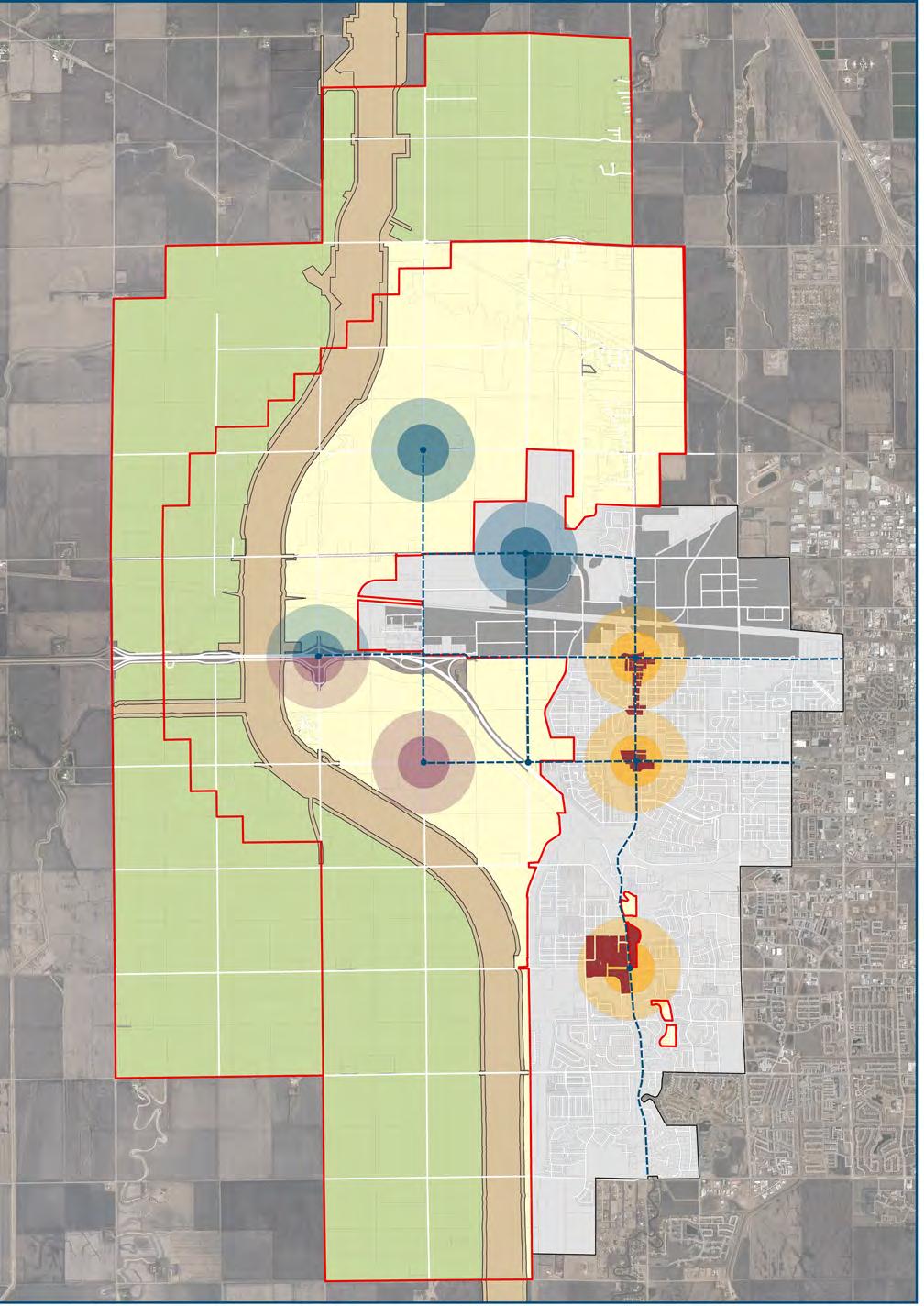 The site of the lagoons may be a good location for residential or mixed-use development considering the demand for more industrial space within city limits, the lagoons, if moved, could present a great location for an extended industrial village. This plan presents an alternative to the conventional industrial park, imagining the lagoons as a self-sustaining center for industry and “making” in the region. People who currently work in West Fargo’s existing industrial area must drive to meet all of their daily needs. The Lagoons Industrial Village could accommodate a variety of manufacturing, office, and other industrial uses, as well as the services and recreational opportunities needed to support workers and reduce the number of car trips on local roads. Designed around a network of interconnected streets, the Lagoons Industrial Village would provide a healthy and convenient place for workers. This area also presents opportunities for expansion of the local airport to welcome larger corporate jets, allowing executives to easily come and go from destinations around the country.
