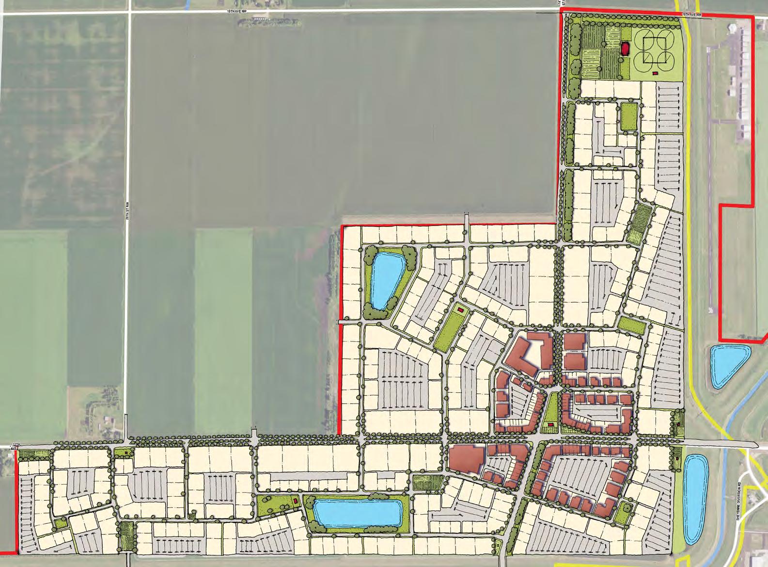 West Fargo has seen tremendous growth within the last few decades and all of this growth has occurred in the form of conventional suburban development. This plan shows how future residential development could take place following the newer model of traditional neighborhood development which creates a vibrant neighborhood that includes several types of residential buildings (townhouses, duplexes, small, medium and large homes), as well as opportunities for some small-scale mixed-use commercial along 52nd Ave.). The illustrative plan also shows the creation of public parks and greenways with the front of houses facing them, providing “eyes on the parks” and making them safer, more welcoming and accessible to all (rather than having backyards face on the open space like many subdivisions currently do). For lots close to the center of the neighborhood, rear alleys and lanes provide access to garages that are placed behind the homes, allowing for a more interesting and walkable streetscape. On lots where front driveway access is provided, garages are set back at least 20 feet from the facade of the building so that the garage doors are not the prominent architectural feature of the house and allows any cars parked in the driveway to be behind the front wall of the house. This also keeps the streetscape more inviting by having home facades and porches on the street.