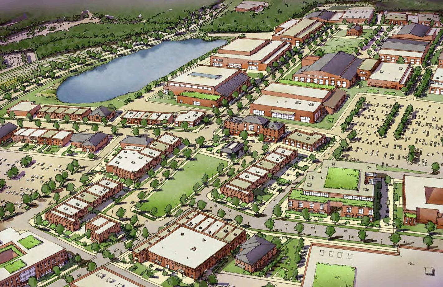The plan includes locations for clusters of manufacturing and warehouse buildings, for both large-scale and medium-sized footprints. This arrangement allows for these industrial uses to be physically separated from office and retail. It accommodates for potential noise and fumes, while still being close enough to be a reasonable walk to nearby support services. Like historic factories, the Industrial Park Plan shows the buildings pulled up to the street and located close to adjacent buildings to enable this area to remain convenient for walking. Light Imprint design principles have been incorporated to promote sustainable stormwater solutions. Some of these buildings could integrate incubator or makerspaces to provide spaces for smaller startups. Large, medium and small-scale facilities should be offered to allow for a business to run its full lifecycle in the industrial Village moving in the area as the business grows.