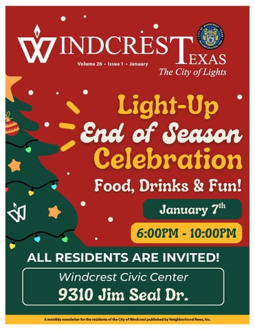 News that’s close to home. NEIGHBORHOOD NEWS Serving Neighborhoods For Over 20 Years Discounts • Multiple AD Sizes Ask about other newsletters in your area 210-558-3160 sales@neighborhoodnews.com ADVERTISE HERE Time Dated 8601 Midcrown Windcrest, TX 78239-2598 the City of Lights PRSRT STD U.S. POSTAGE PAID SAN ANTONIO,TX PERMIT NO.1568 Advertise with us! For information, call (210) 558-3160 or email Sales@NeighborhoodNews.com Published and distributed by: Neighborhood News, Inc. 3740 Colony Drive Suite LL100, San Antonio, TX 78230 • www.NeighborhoodNews.com Articles that appear in the City of Windcrest newsletter do not necessarily reflect the official position of Neighborhood News, Inc. and their publication does not constitute an endorsement therein. The appearance of any advertisement in the City of Windcrest newsletter does not constitute an endorsement by Neighborhood News, Inc. of the goods or services advertised. Neighborhood News, Inc. is not responsible for errors beyond the cost of the actual ad space. Any publication of Neighborhood News, Inc., whether draft or final is the sole property of Neighborhood News, Inc. and cannot be reproduced or distributed in any way, whether in print or electronically, without the express written consent of Neighborhood News, Inc. ©Neighborhood News, Inc. Join In The Neighborhood for a weekly dive into community ma ers Scan the QR code below to sign up for insightful discussions and local highlights, landing in your inbox every Friday!
