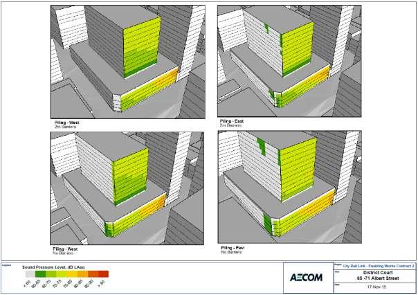 When utilities works and piling are immediately outside of the building noise levels in the enclosed balcony areas of the most exposed apartments on Level 12 may reach 65 dB LAeq The works in this area will be of a limited duration. The most effective way to reduce noise levels further will be to close the louvres. With the louvres closed the noise levels in the enclosed balcony areas of the most exposed apartments on Level 12 may reach 55 - 60 dB LAeq