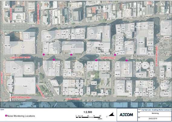 Noise levels will be measured continuously in 15 minute intervals for the duration of construction works in the area between 20m north of Mills Lane and 20m south of Swanson Street. Audio may be recorded (with the permission of Stamford Residences) along with noise levels to help exclude extraneous sources such as conversation, traffic and building services from the results.