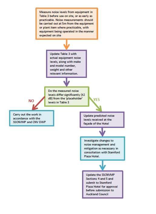 Construction noise will be measured and assessed in accordance with New Zealand Standard NZS6803:1999 “Acoustics – Construction Noise”. Construction noise will be managed to comply with the Project Standards (unless otherwise provided for in an approved SSCNMP). The Project Standards for construction noise are detailed in Table 3 and are applicable 1m from any building façade. Section 5.1 of the CNV DWP details equipment and associated noise levels for construction activities. Section 10 of the CNV DWP details how construction activities will be measured/ assessed against the noise criteria If any construction activity cannot practicably comply with these limits, a SSCNMP will be produced in accordance with Section 8.1 of this CNV DWP.
