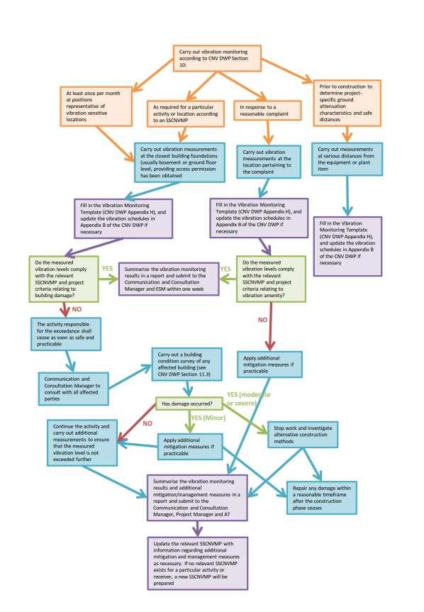 If vibration monitoring demonstrates non-compliance with the vibration building damage limits, the construction activity responsible for the exceedance will cease as soon as safe and practicable to do so. A detailed building condition survey will then be undertaken by a suitably qualified engineer. The survey will be carried out as defined in Section 10.4 of the CNV DWP. This building condition survey is in addition to the building condition survey that will be carried out before work begins.