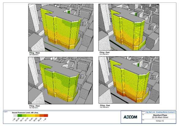 Noise barriers/hoardings will be installed around the work site but they will provide no attenuation to the Stamford Residences which begin at Level 12. Little reduction is provided for receivers located at Level 3 and above.