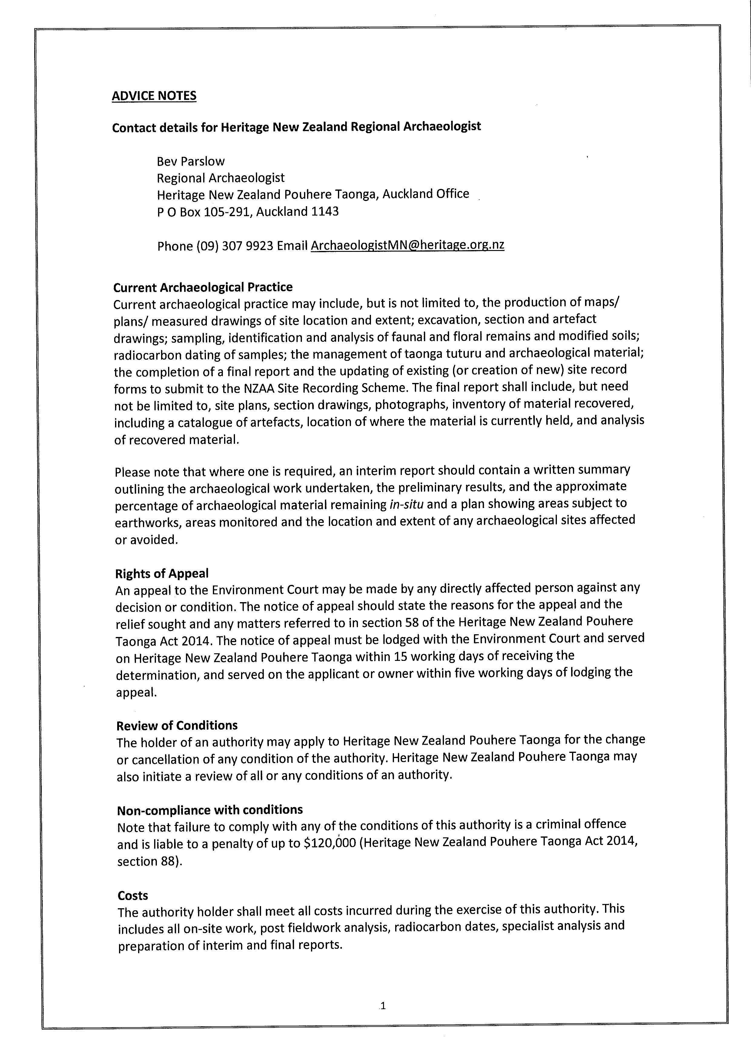Care has been taken to ensure that the archaeological procedures set out in this DWP are consistent with the conditions and requirements of the Authority issued by HNZPT.