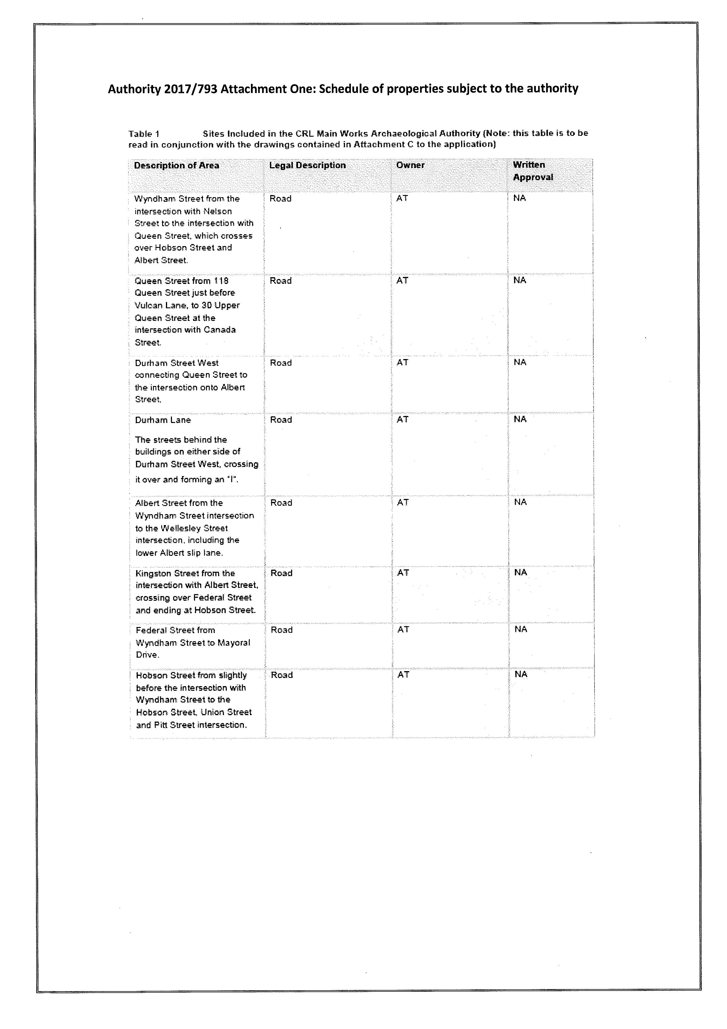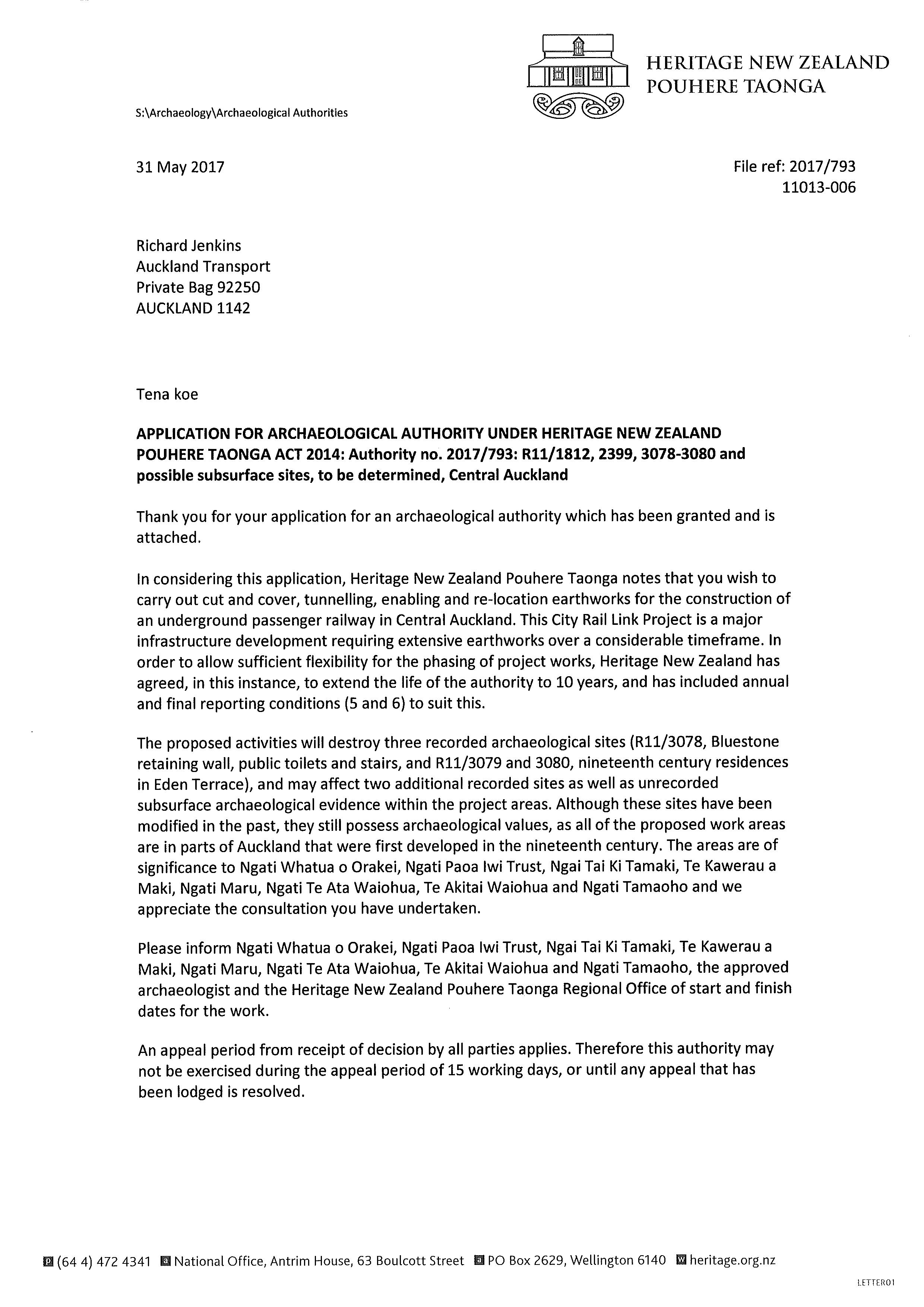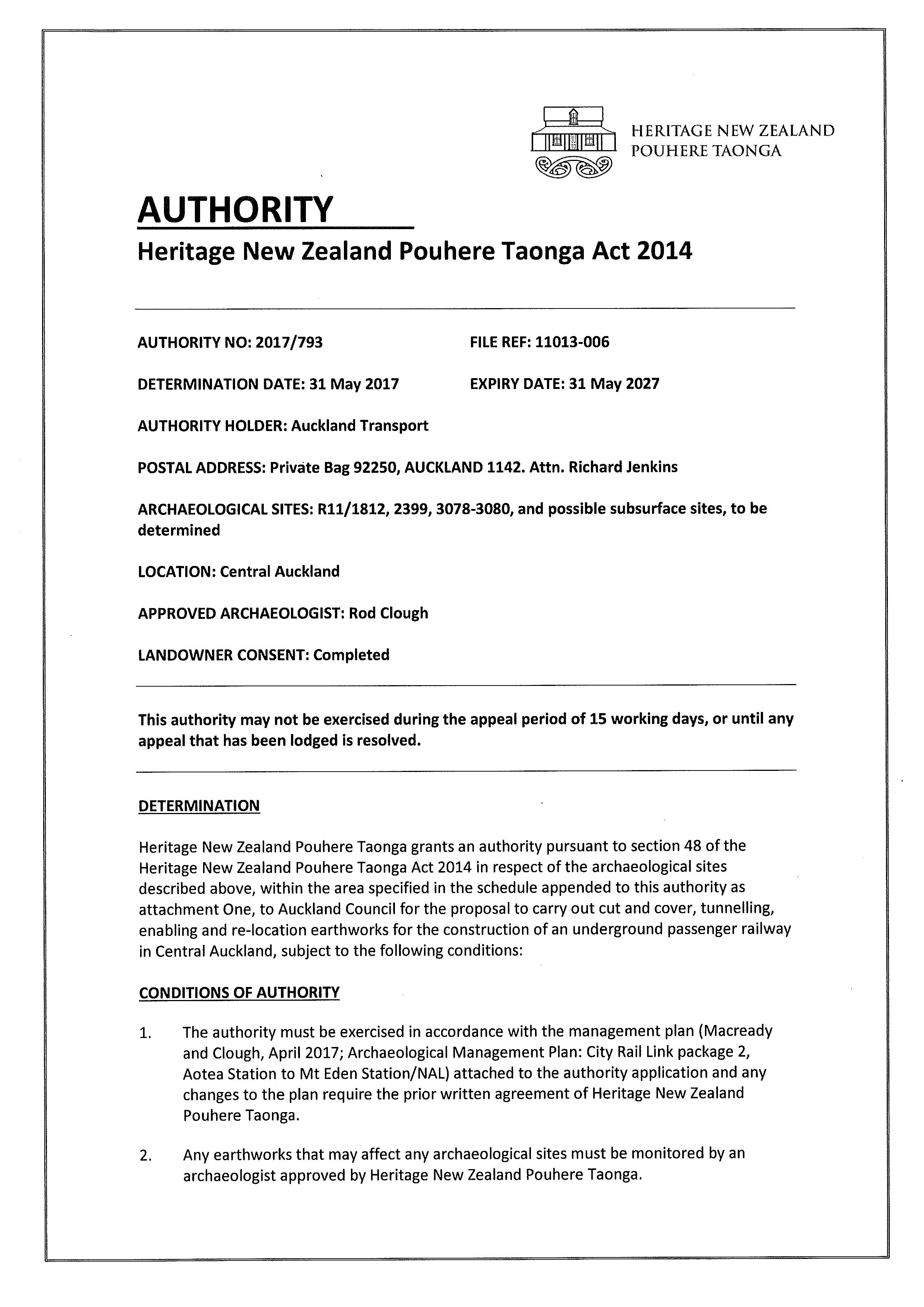 A general Authority for the Aotea Station to Mt Eden Station/NAL works, including the demolition of the buildings at 31 Shaddock Street and 6 Flower Street and modification of any subsurface remains, has been granted by HNZPT (Authority No. 2017/793). The Authority sets management procedures in place for archaeological discoveries.