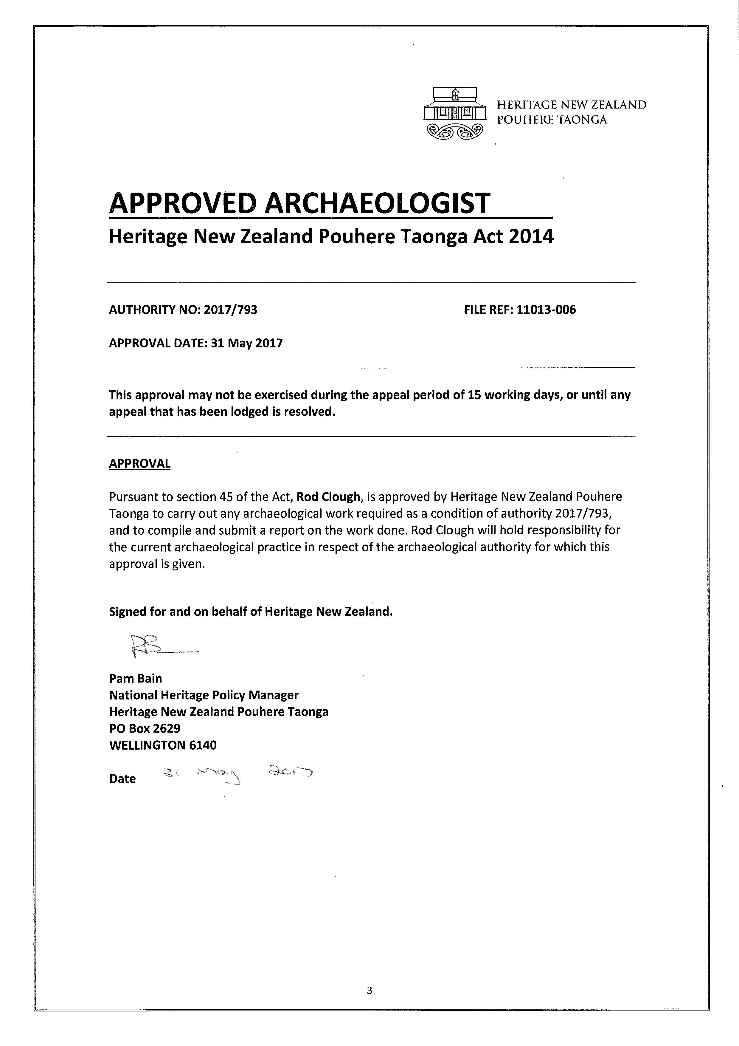 An appropriately qualified Archaeologist has been approved under HNZPT Authority 2017/793 (Appendix A)