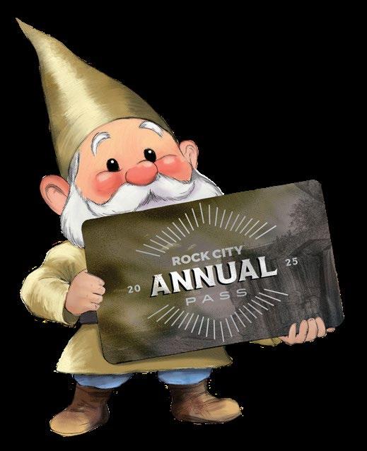formations, Swing-A-Long Bridge, Fairyland Caverns, and seven-state view have been welcoming guests atop Lookout Mountain since 1932. Memories await year-round on Rock City’s 4,100-foot Enchanted Trail as the paths of this historic attraction transform each season. In spring, the gardens are in bloom with native plants, and in summer, guests can cool off with a freshly squeezed lemonade and gentle mountain breezes. Fall brings the splendor of autumn leaves and specialty food and beverages like funnel cakes and themed fudge flavors. Starting in late November, welcome in the award-winning holiday spectacular Enchanted Garden of Lights. Gem membership annual passes are available for special events throughout the year.