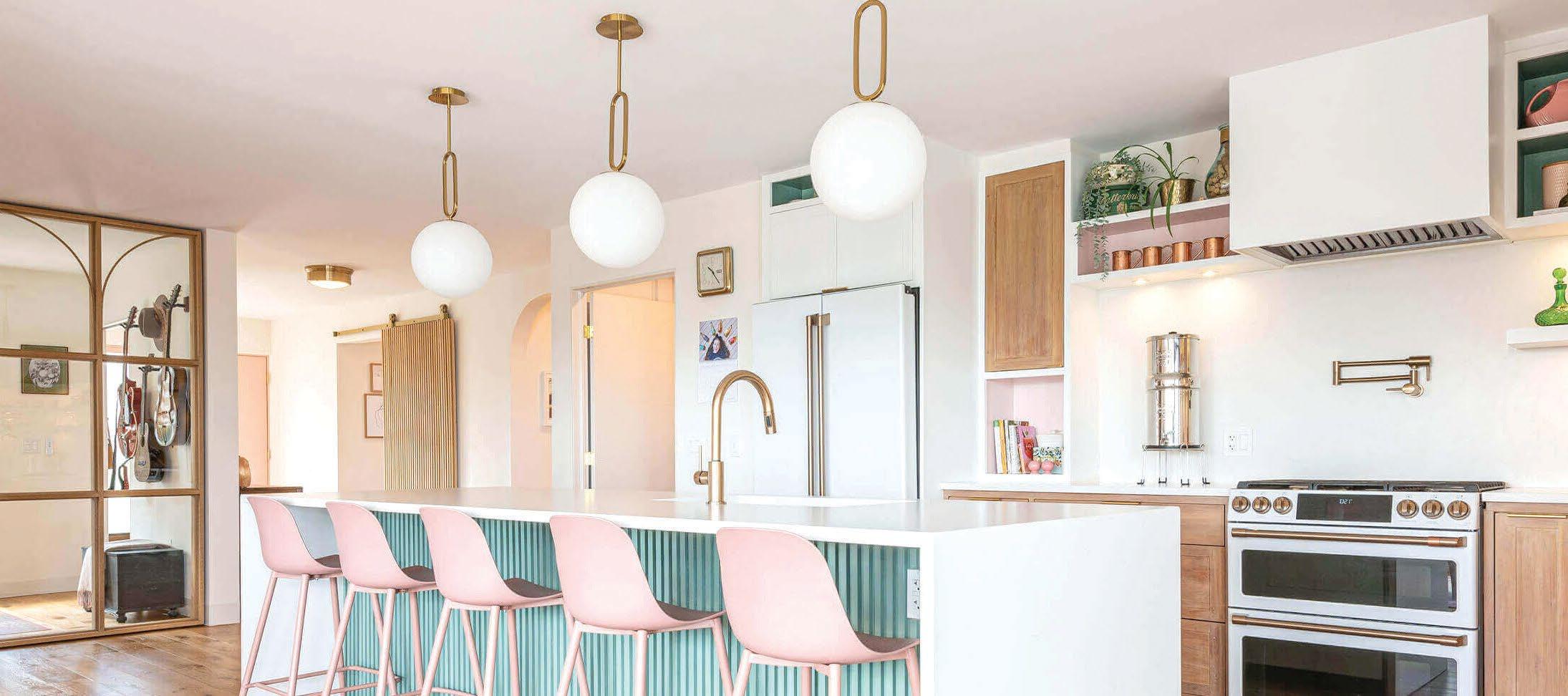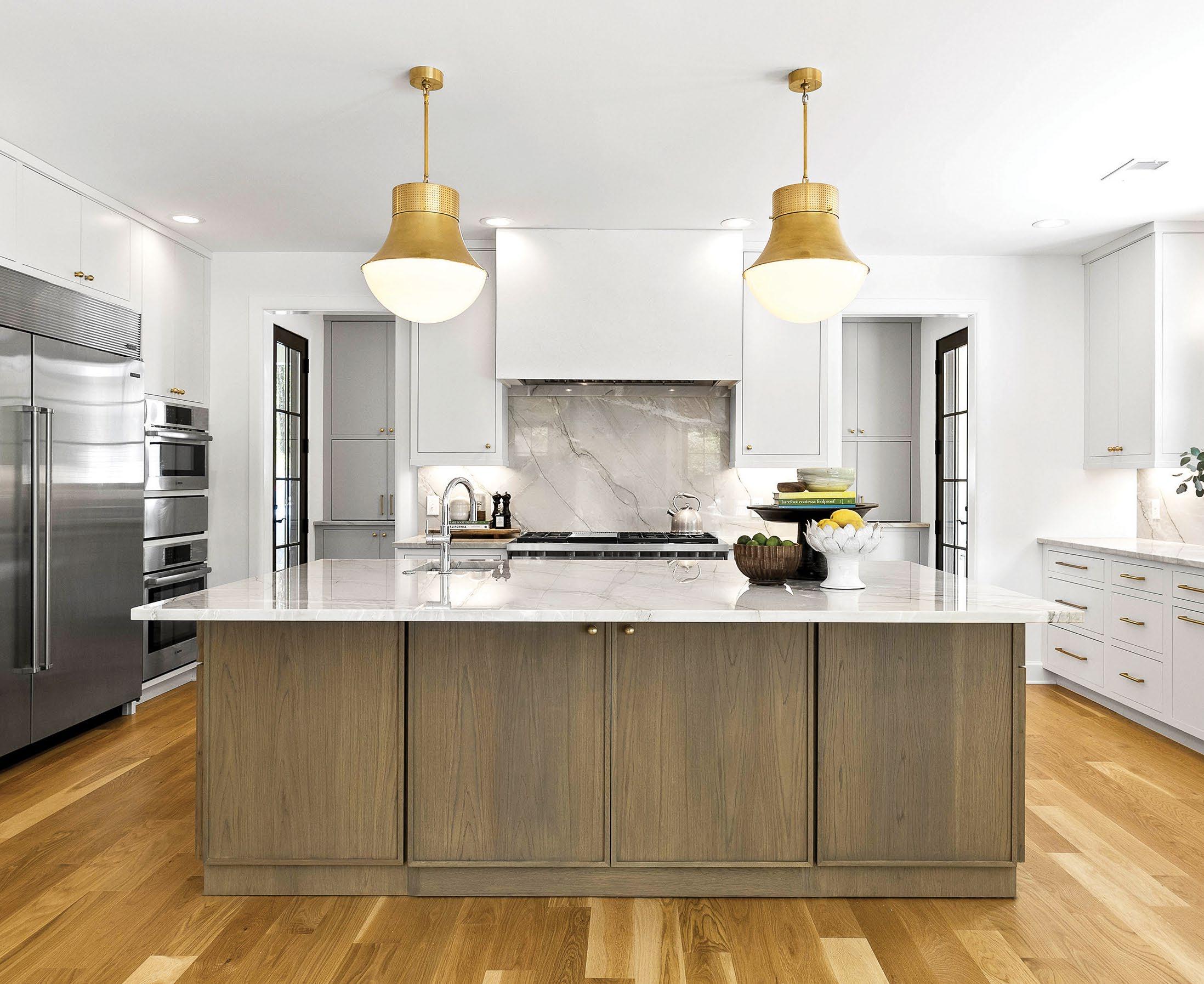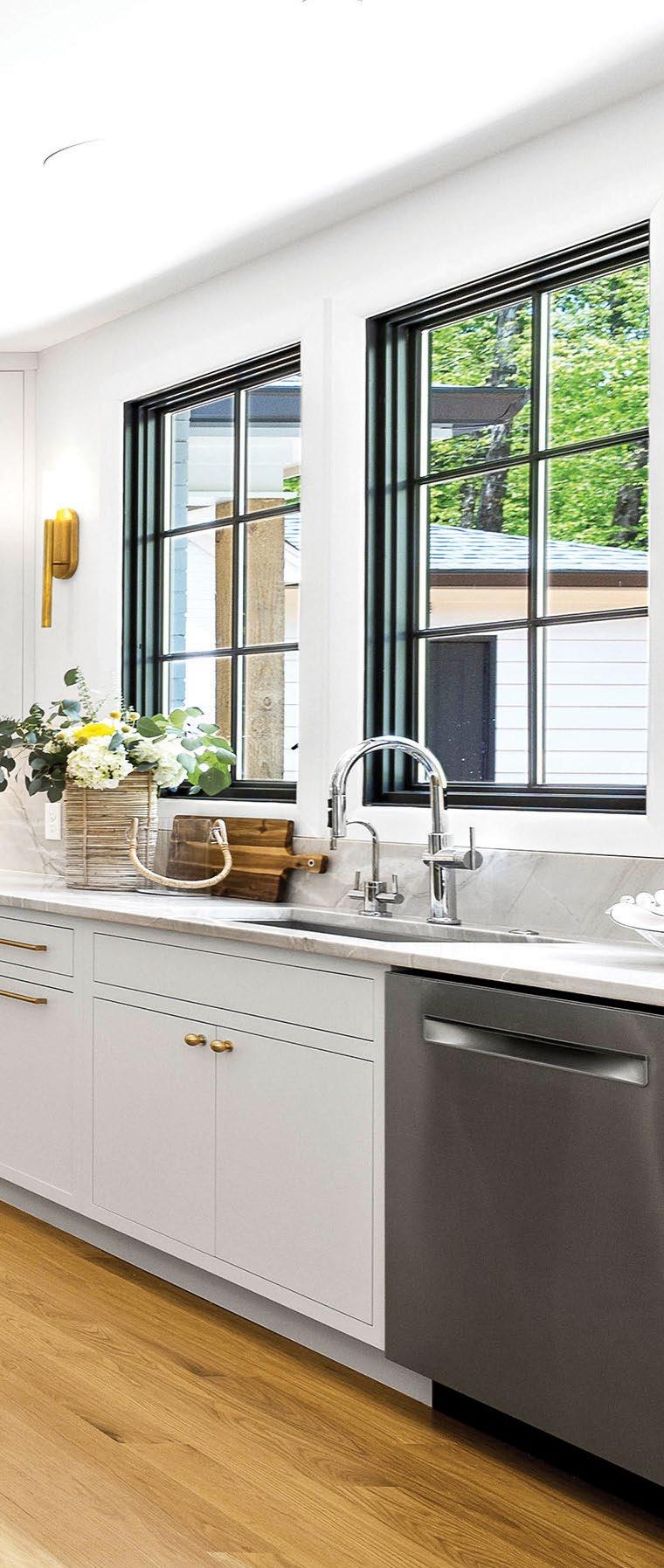 home through the custom fireplace, convenient built-ins in the mudroom, and striking gold light fixtures. The U-shaped kitchen boasts shades of white and soft gray and offers smart storage and ample workspace with a central island that doubles as a breakfast area. This home efficiently uses every inch of its 1,700 square feet to bring functionality to family life.