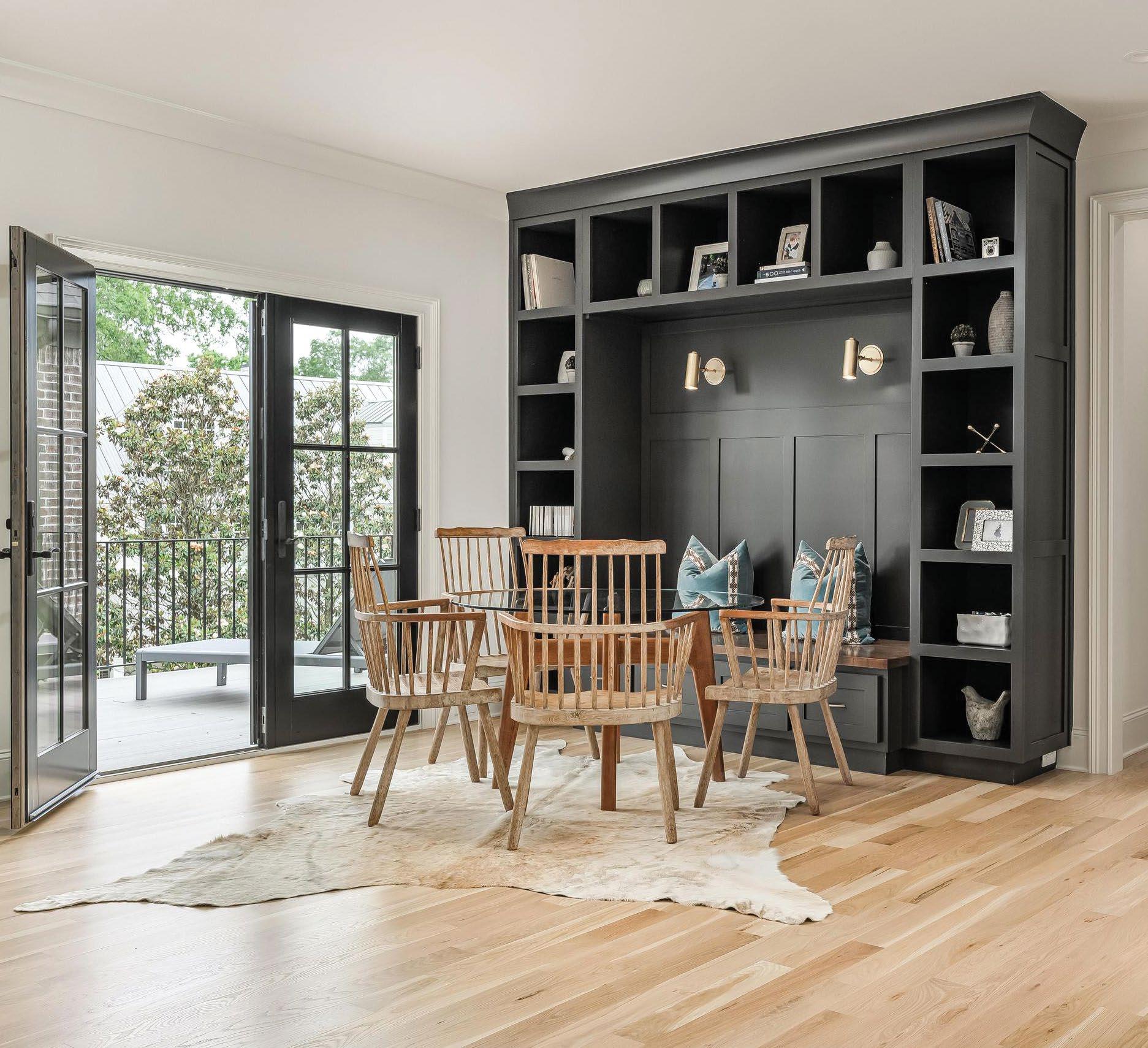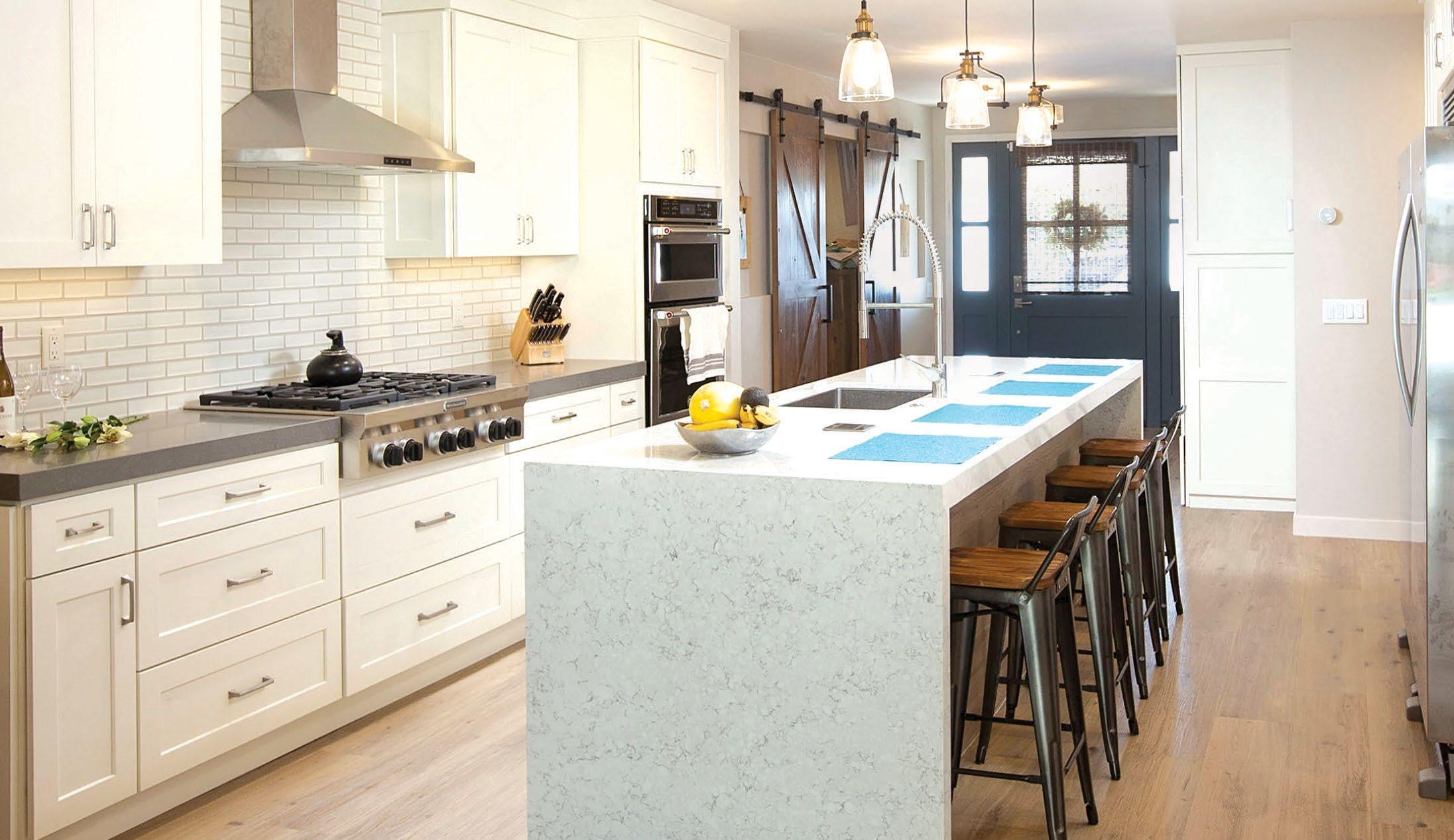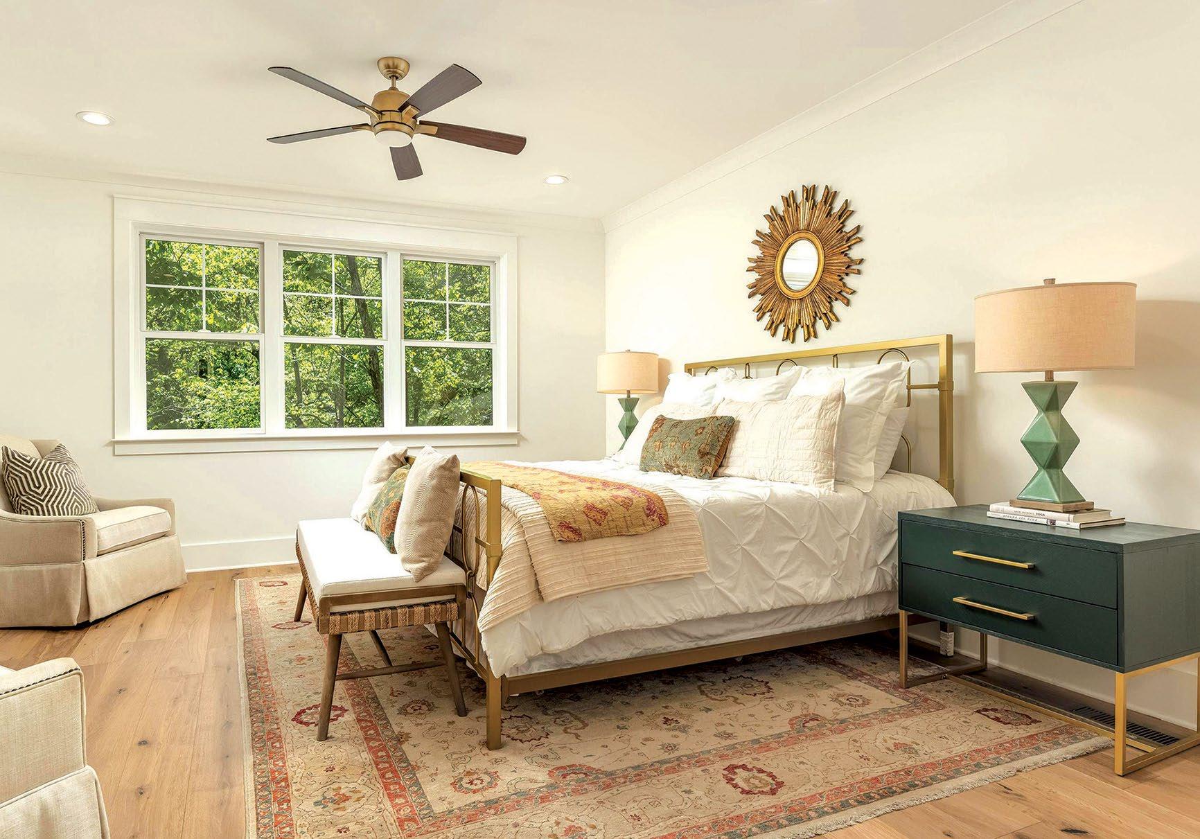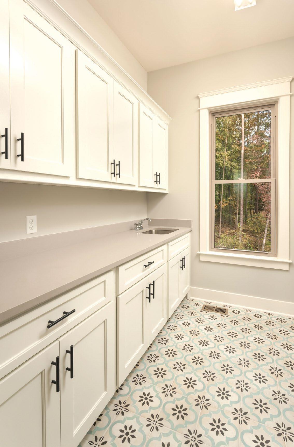 home through the custom fireplace, convenient built-ins in the mudroom, and striking gold light fixtures. The U-shaped kitchen boasts shades of white and soft gray and offers smart storage and ample workspace with a central island that doubles as a breakfast area. This home efficiently uses every inch of its 1,700 square feet to bring functionality to family life.