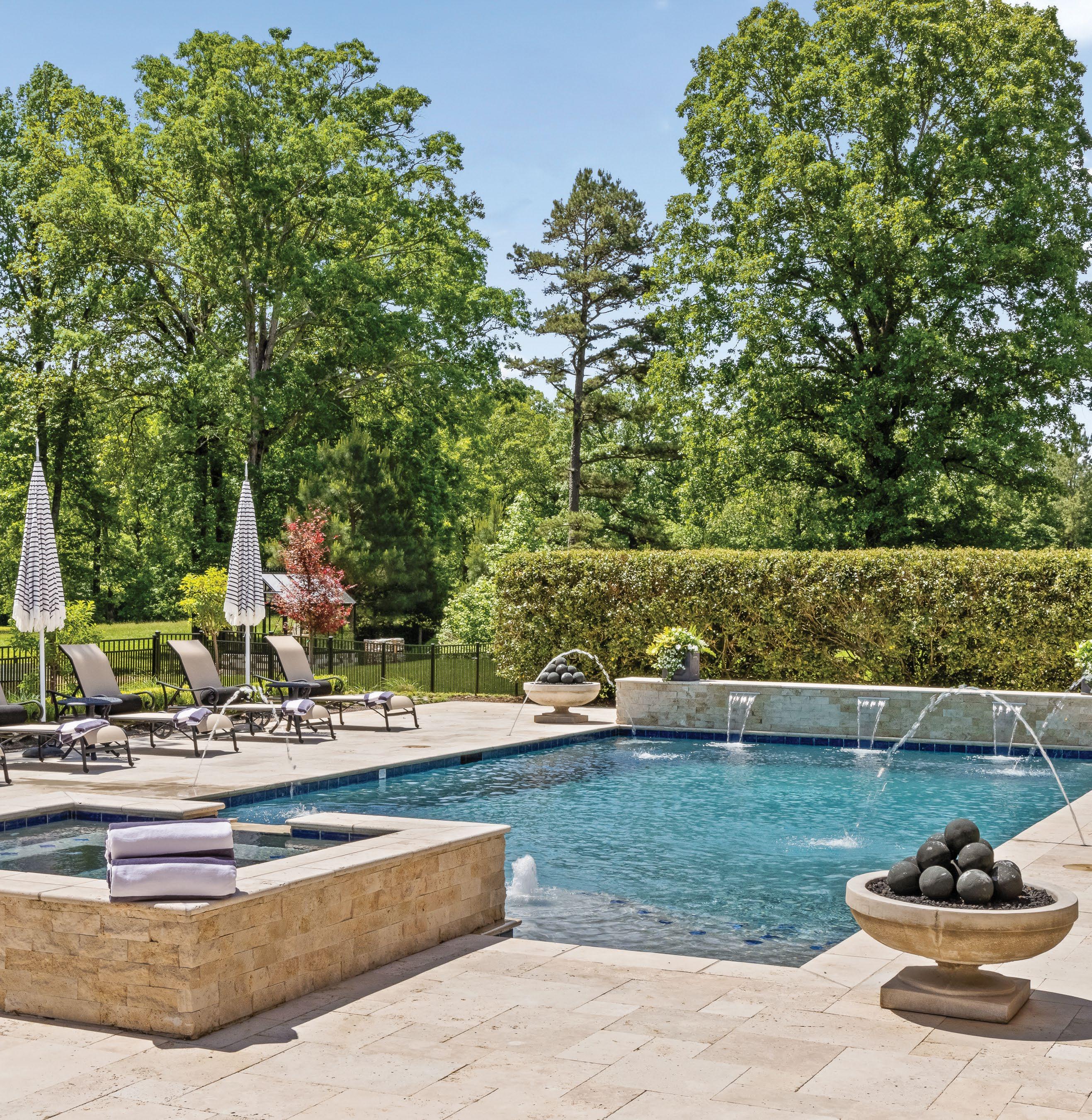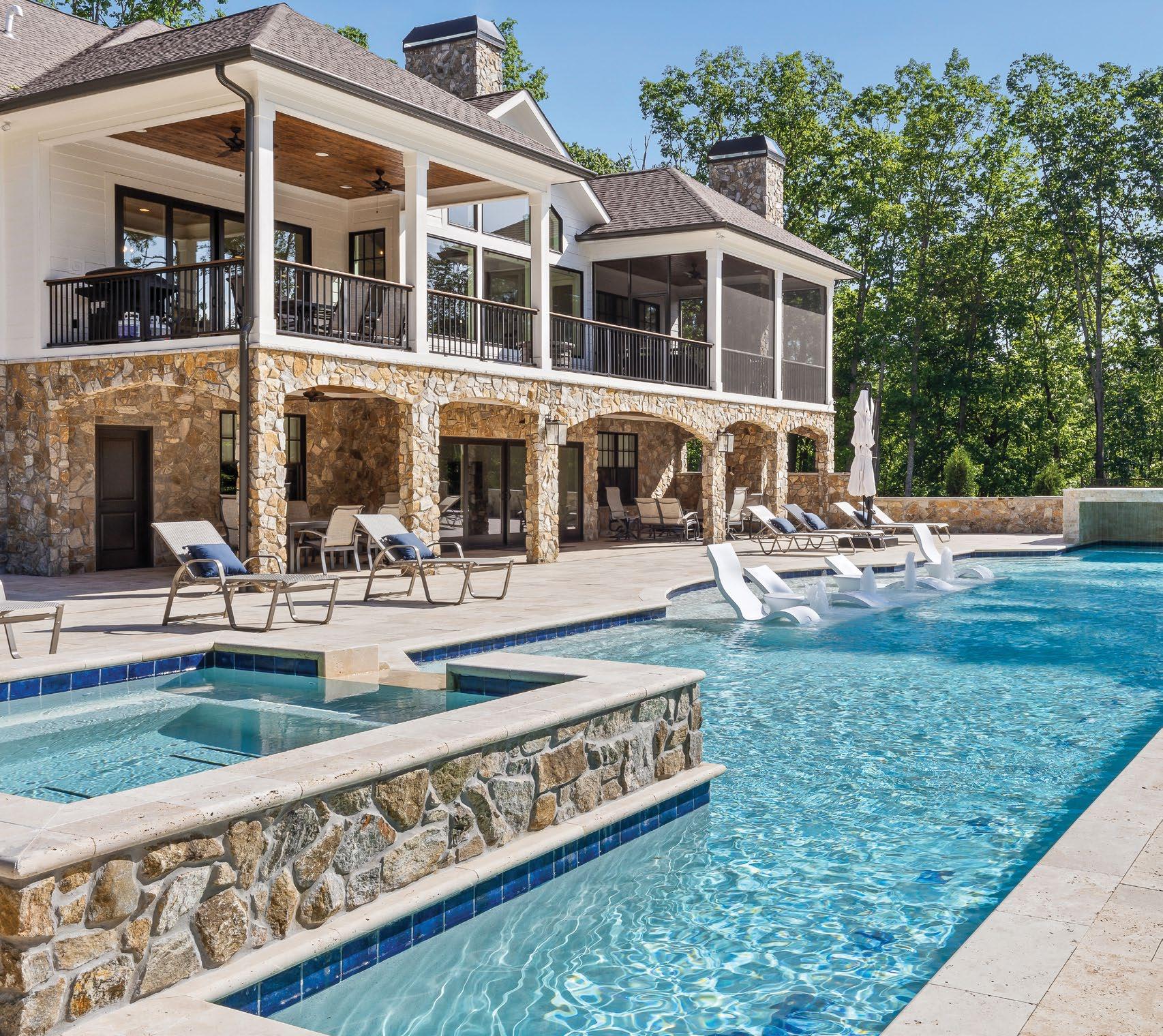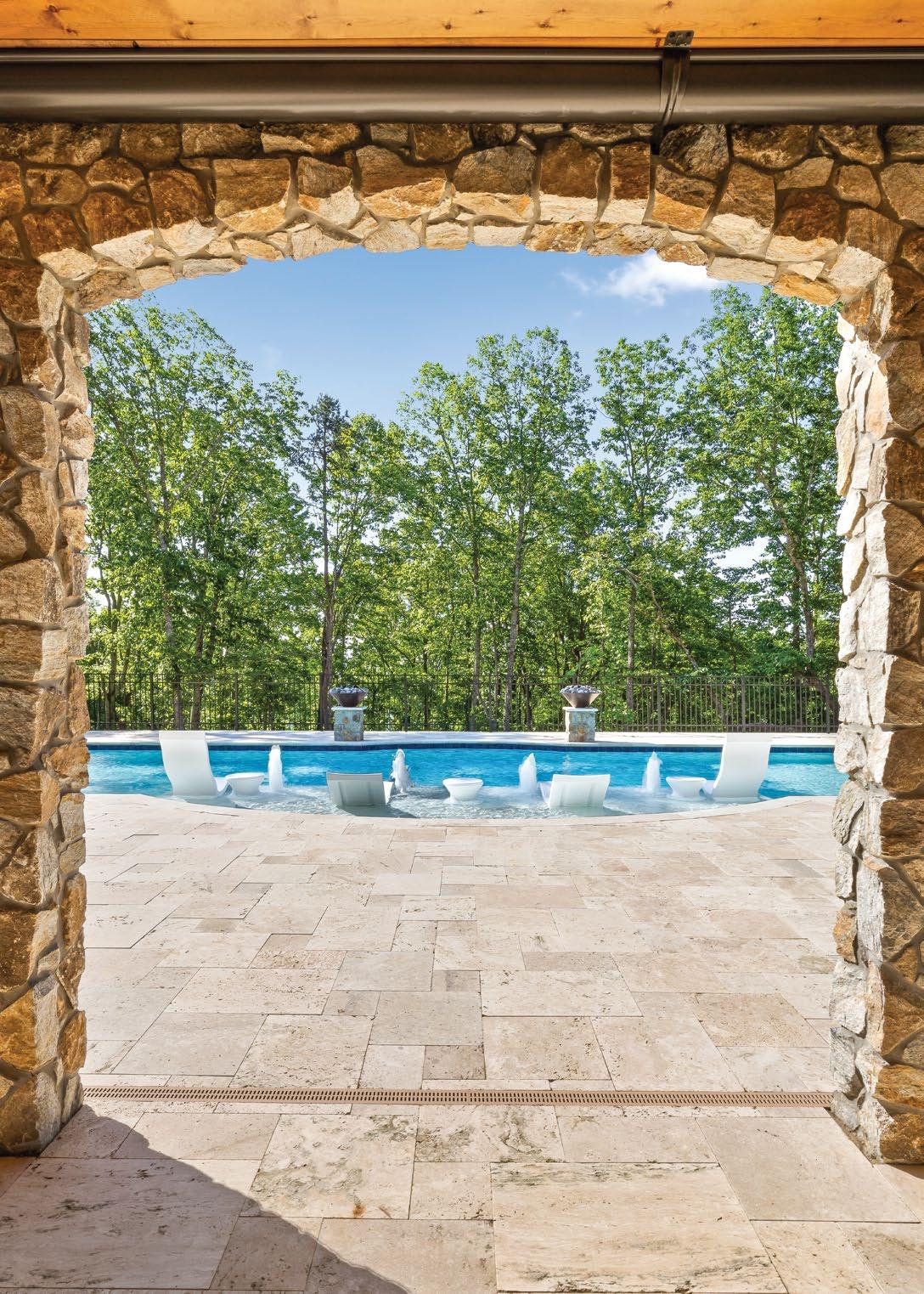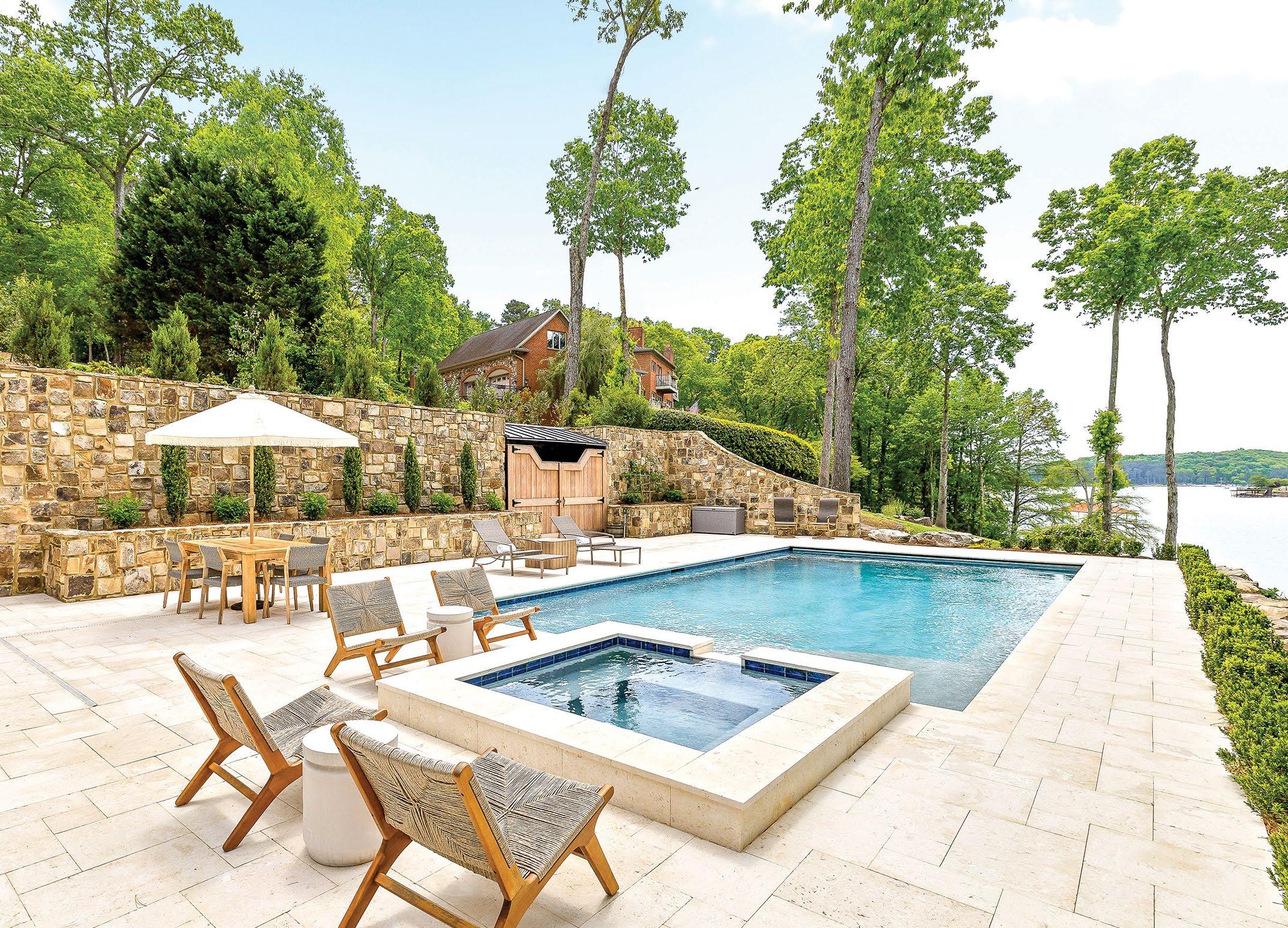 Designed for ultimate relaxation, this charming Southern backyard is the perfect place to enjoy the gorgeous vistas of Chickamauga Lake. The same stacked stone continues from the home to the poolscape, creating a cohesive space with an emphasis on nature. Natural elements are a priority in everything from the curated landscaping to the simple but stylish wood tables and woven chairs, and the tasseled umbrella offers a bohemian flair. An outdoor shower is tucked away in a nook featuring plenty of tropical greenery for a luxurious rinse. The elegant but understated pool layout offers optimal views of the lake whether you’re enjoying the spa that spills into the pool or relaxing on the sun shelf with soothing bubblers. The smooth and light travertine pool decking protects bare feet from the hot summer sun and ample seating provides plenty of opportunity for gathering together to appreciate the scenery.