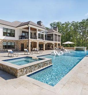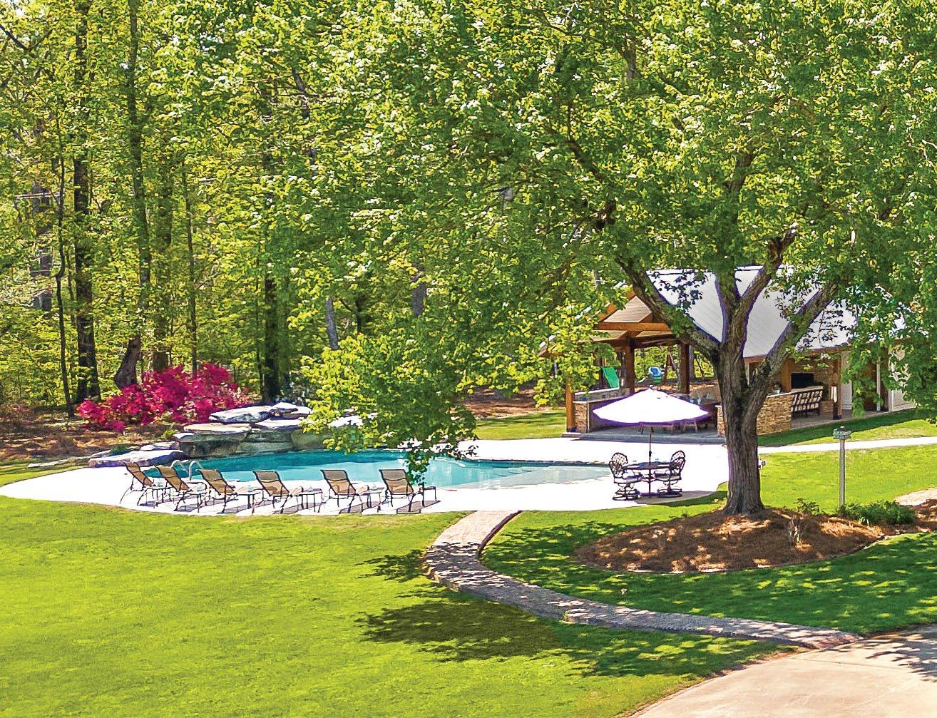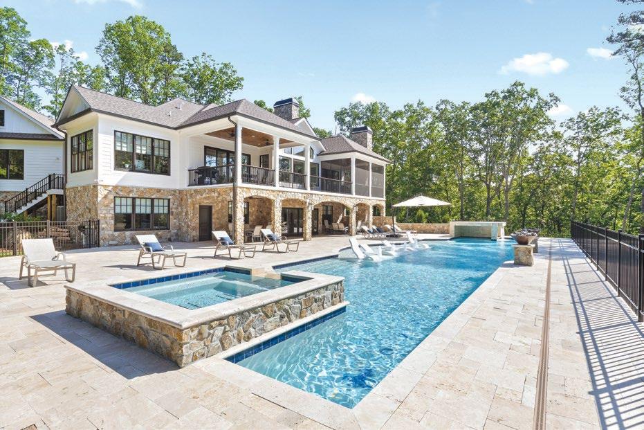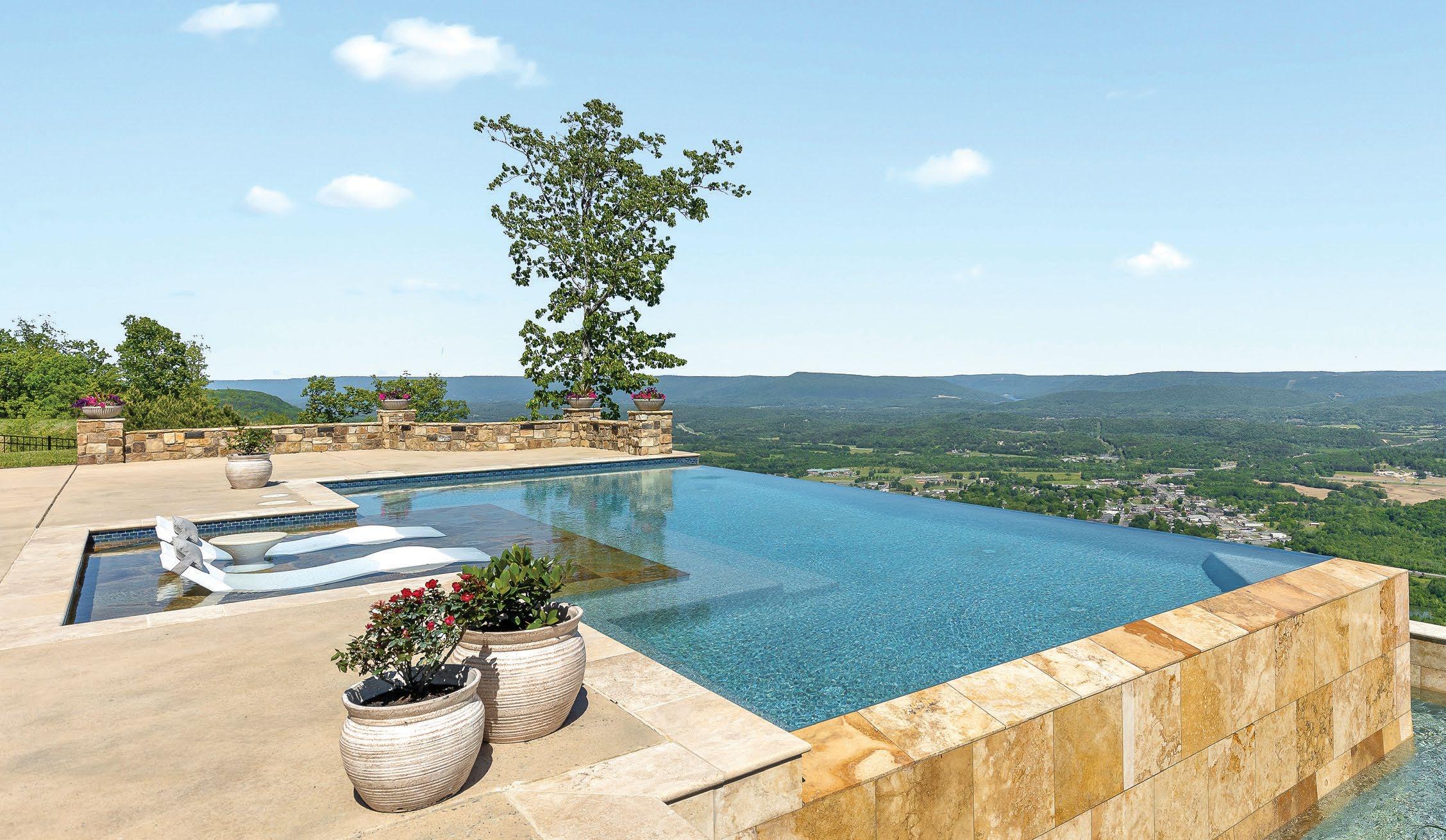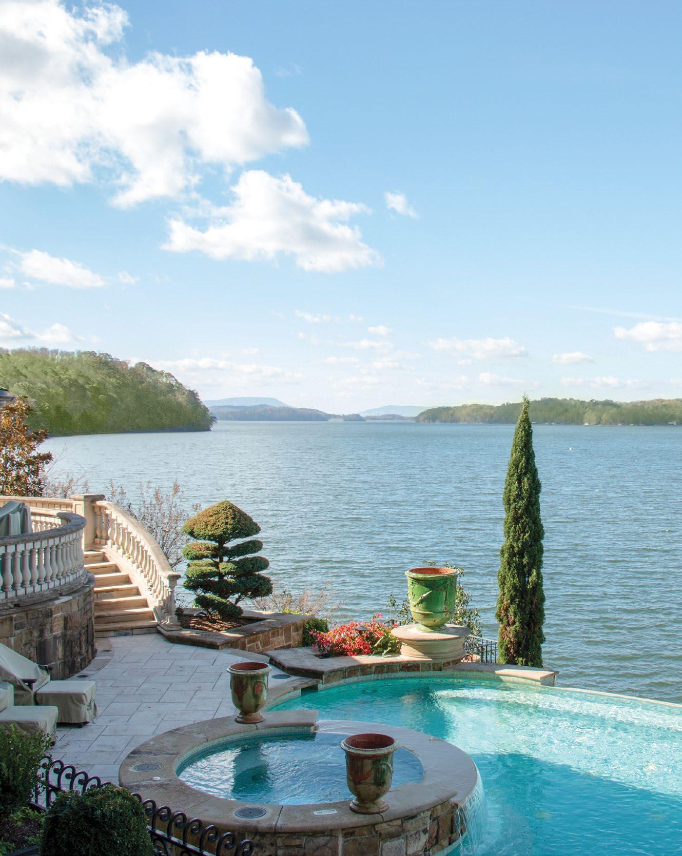 Designed for ultimate relaxation, this charming Southern backyard is the perfect place to enjoy the gorgeous vistas of Chickamauga Lake. The same stacked stone continues from the home to the poolscape, creating a cohesive space with an emphasis on nature. Natural elements are a priority in everything from the curated landscaping to the simple but stylish wood tables and woven chairs, and the tasseled umbrella offers a bohemian flair. An outdoor shower is tucked away in a nook featuring plenty of tropical greenery for a luxurious rinse. The elegant but understated pool layout offers optimal views of the lake whether you’re enjoying the spa that spills into the pool or relaxing on the sun shelf with soothing bubblers. The smooth and light travertine pool decking protects bare feet from the hot summer sun and ample seating provides plenty of opportunity for gathering together to appreciate the scenery.