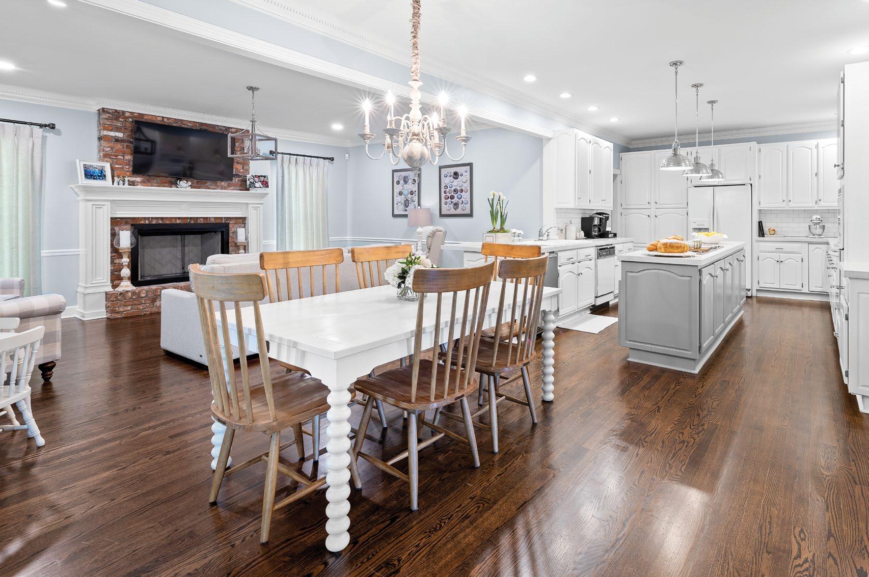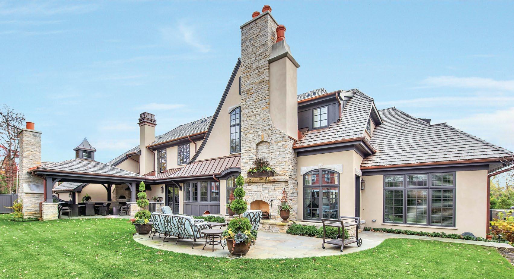 easy style bar. Entertaining is central to this home, especially in the kitchen. A home chef’s dream, there is ample storage and workspace, plus an eat-in island in addition to the prep island. Just outside is a well-appointed outdoor kitchen, complete with an outdoor fireplace, built-in grill, pizza oven, and even a drop-down screen for backyard movie nights. Inside and out, this home is perfect for family gatherings and neighborhood get-togethers.