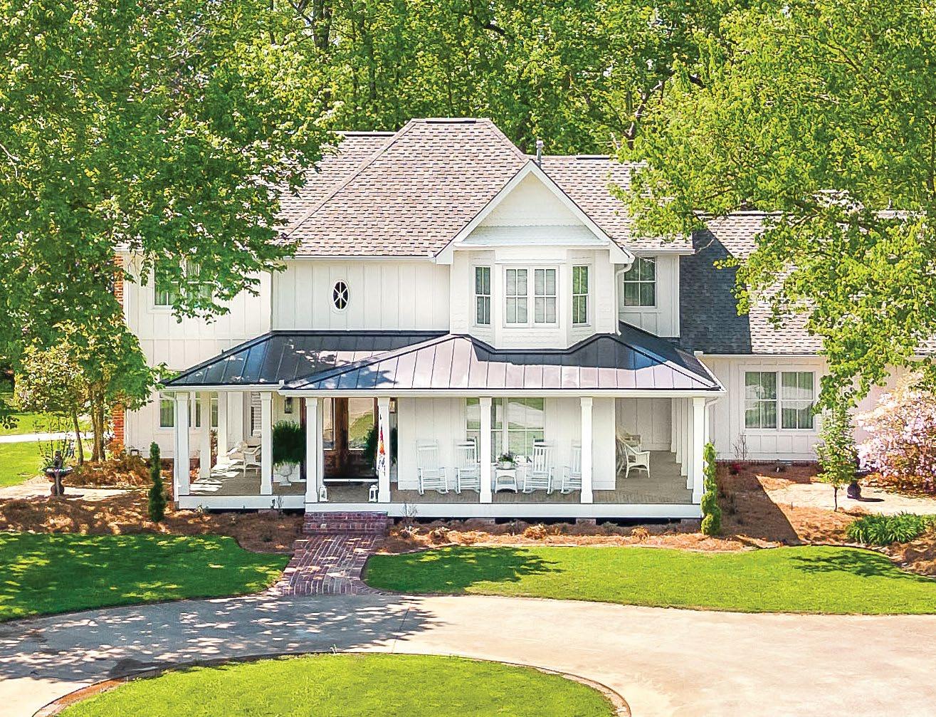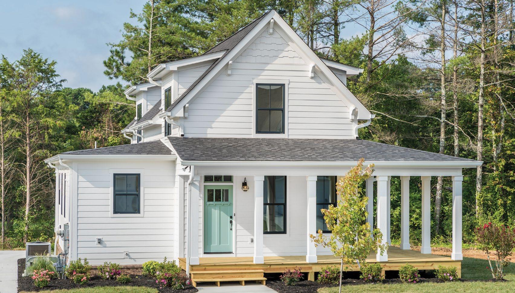 Moderndesign meets classic farmhouse charm in this multi-level home. The exterior emphasizes clean lines with its bright white siding, columns, and gabled roof with simple brackets, while the wraparound porch offers the perfect opportunity for entertaining and appreciating the surrounding nature. Three bedrooms and two and a half baths are included in this intimate yet open floor plan, along with subtle vintageinspired selections such as a farmhouse sink and retro pale-blue front door. Elevated features can be found throughout the
