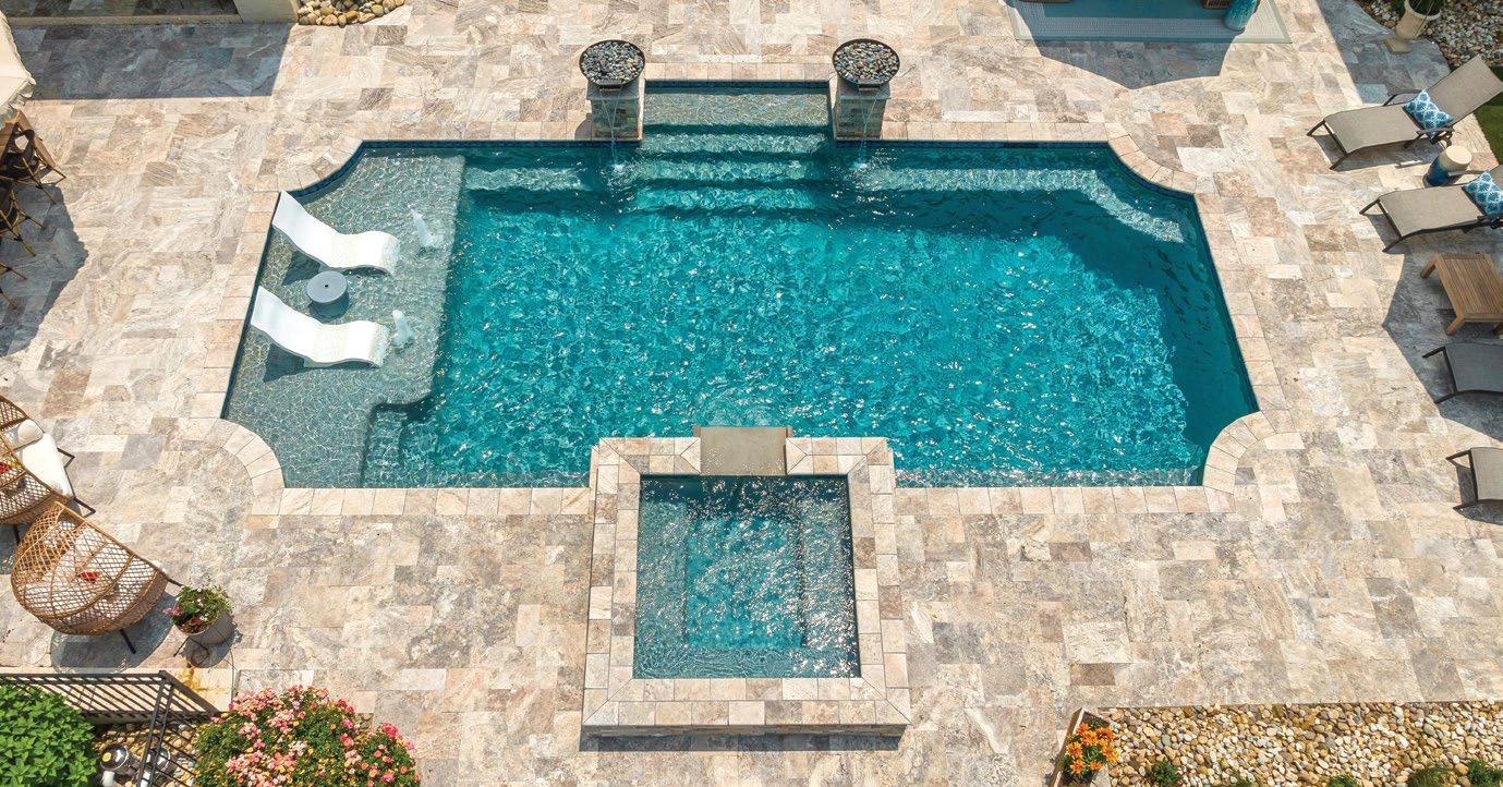 This Grecian-style pool features iconic reverse corners to create an elevated old-world ap pearance. It also features numerous modifications and additions, making it an over-the-top, opulent outdoor escape. From the expansive sun shelf with bubblers and umbrella support to dual spillways, the water flow sound helps encircle the space with a relaxing ambience. A rectangular spa features blue cut-glass tiles on its face, surrounding its spillway. Directly across from the spa is a raised water feature which produces the second spillway, boasts the same cut-glass tile facing, and even incorporates a firebox across the length of its top. Com bined with the underwater, colored LED lights, this fire feature amplifies the area’s visual interest at night. Heated, self-cleaning, and wrapped by an ivory travertine tile decking, this pool area is a truly decadent retreat.