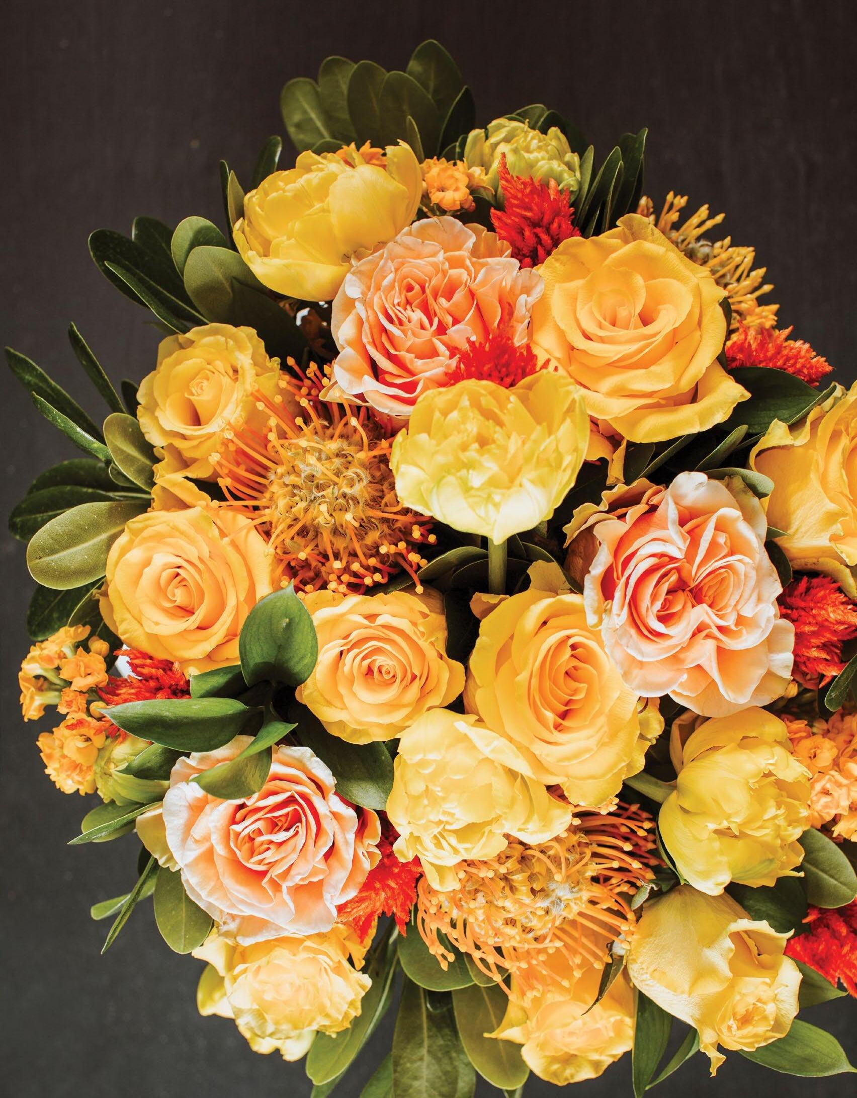 Phoenix and yellow roses, pin cushion protea, celosia, tulips, and pittosporum