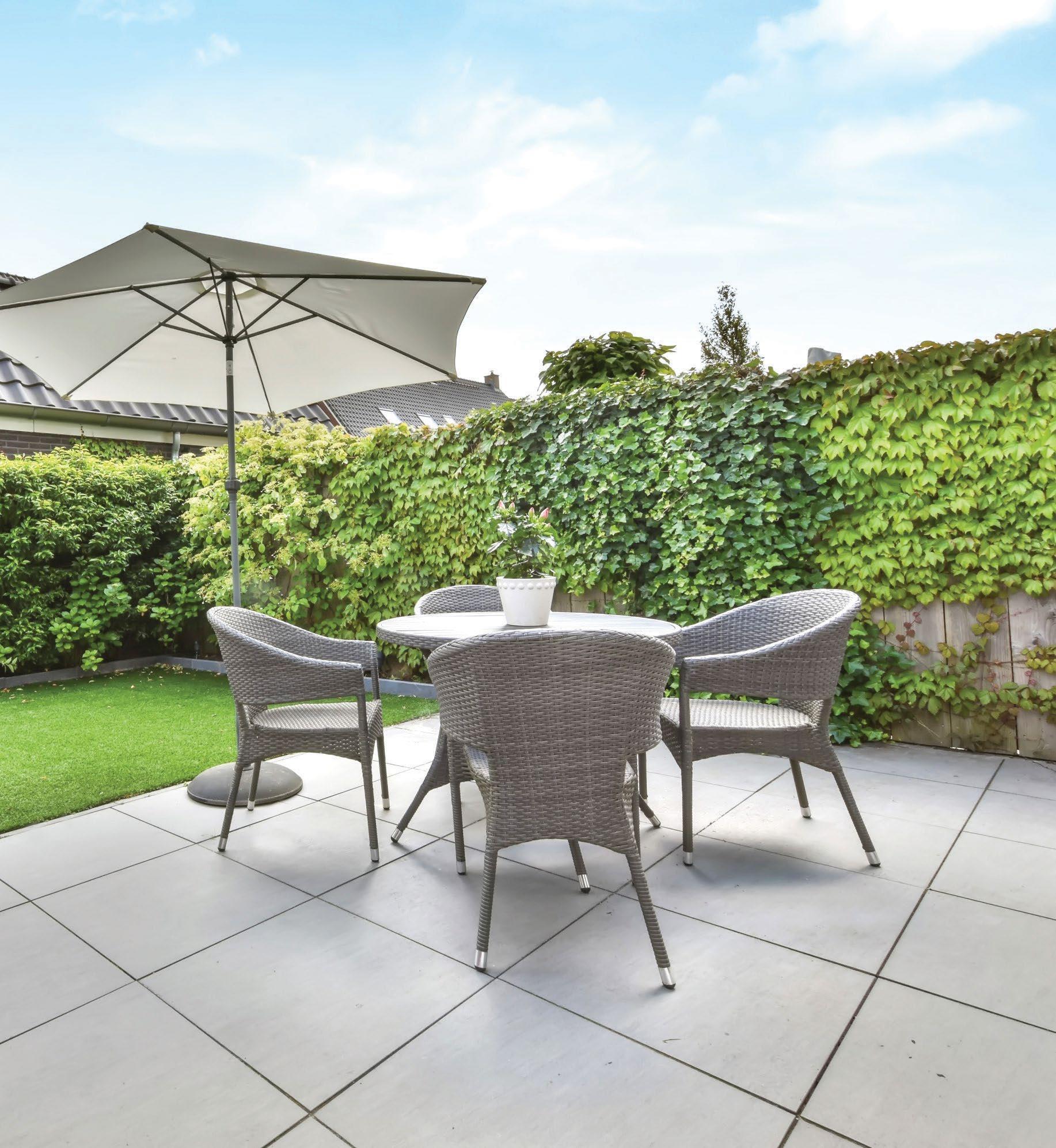 imported from Turkey in silver tones that complements the home’s style and stays cool in warmer months. The deck and covered porch provide ample space for entertaining and offer a variety of seating options from wicker egg chairs to sun loungers and a dining table. This outdoor space is the perfect combination of function and beauty.
