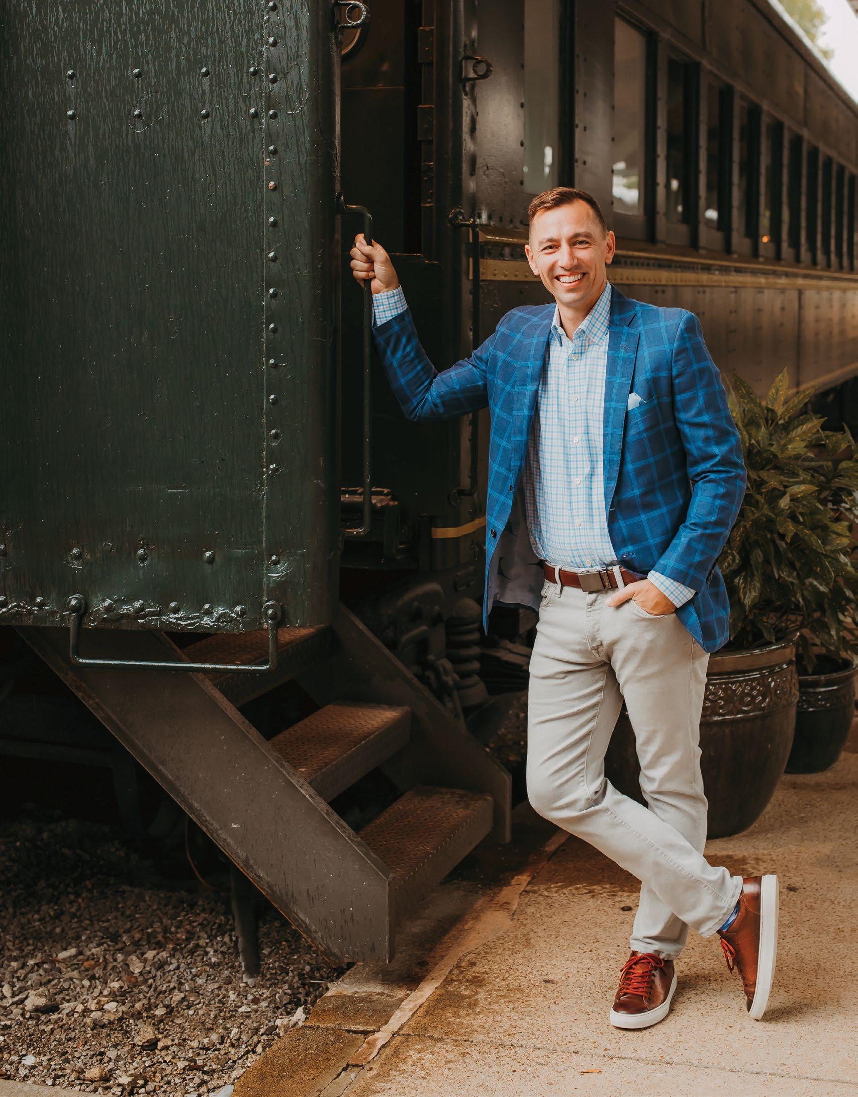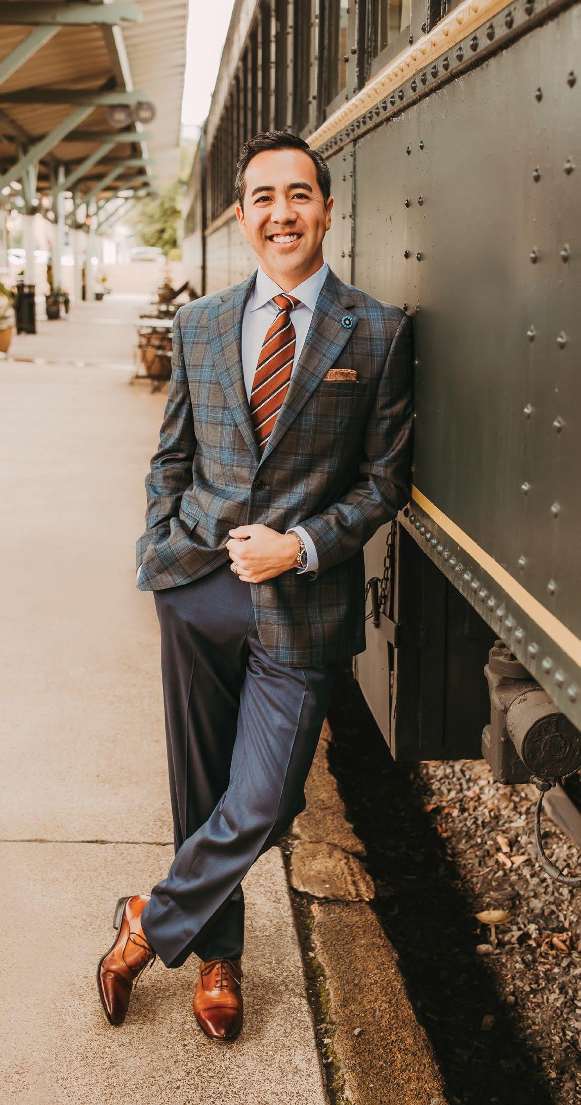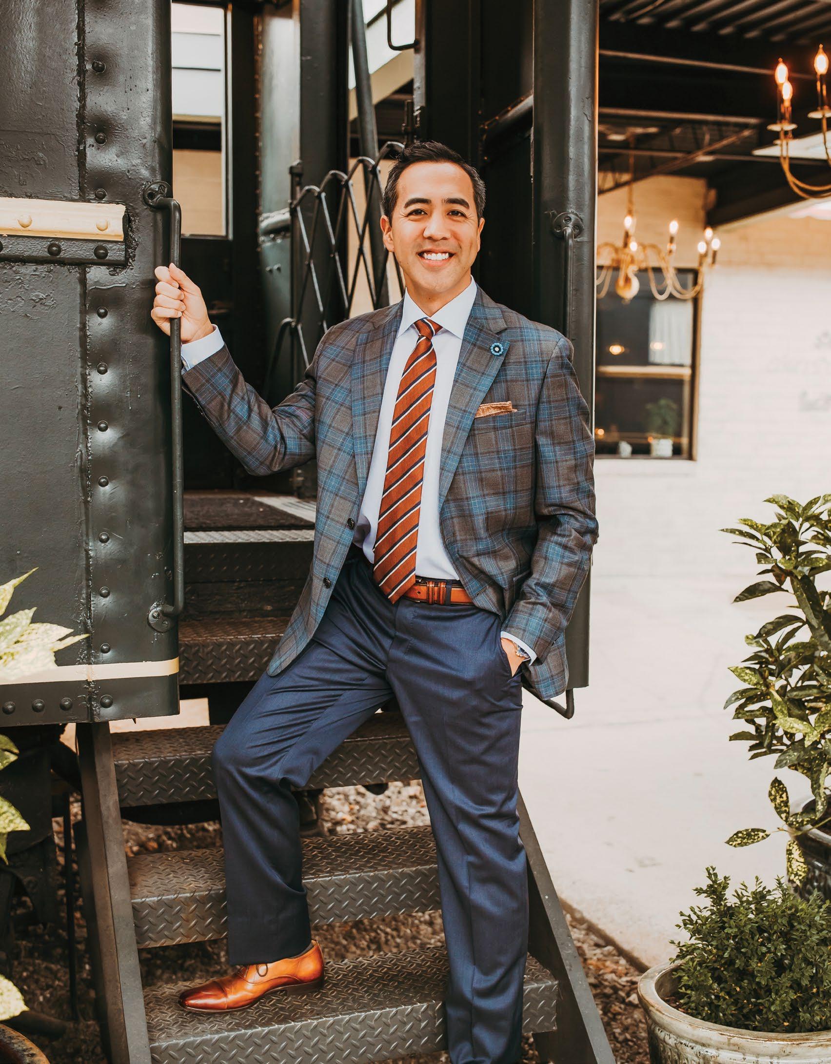 This ensemble expertly combines both patterns and colors. Dr. Dizon’s plaid sport coat pairs nicely with navy dress pants, and his crisp white shirt provides the perfect background for a striped rust tie to pop. Additional warm accents include a pocket square and leather shoes, tying this sophisticated look together.
