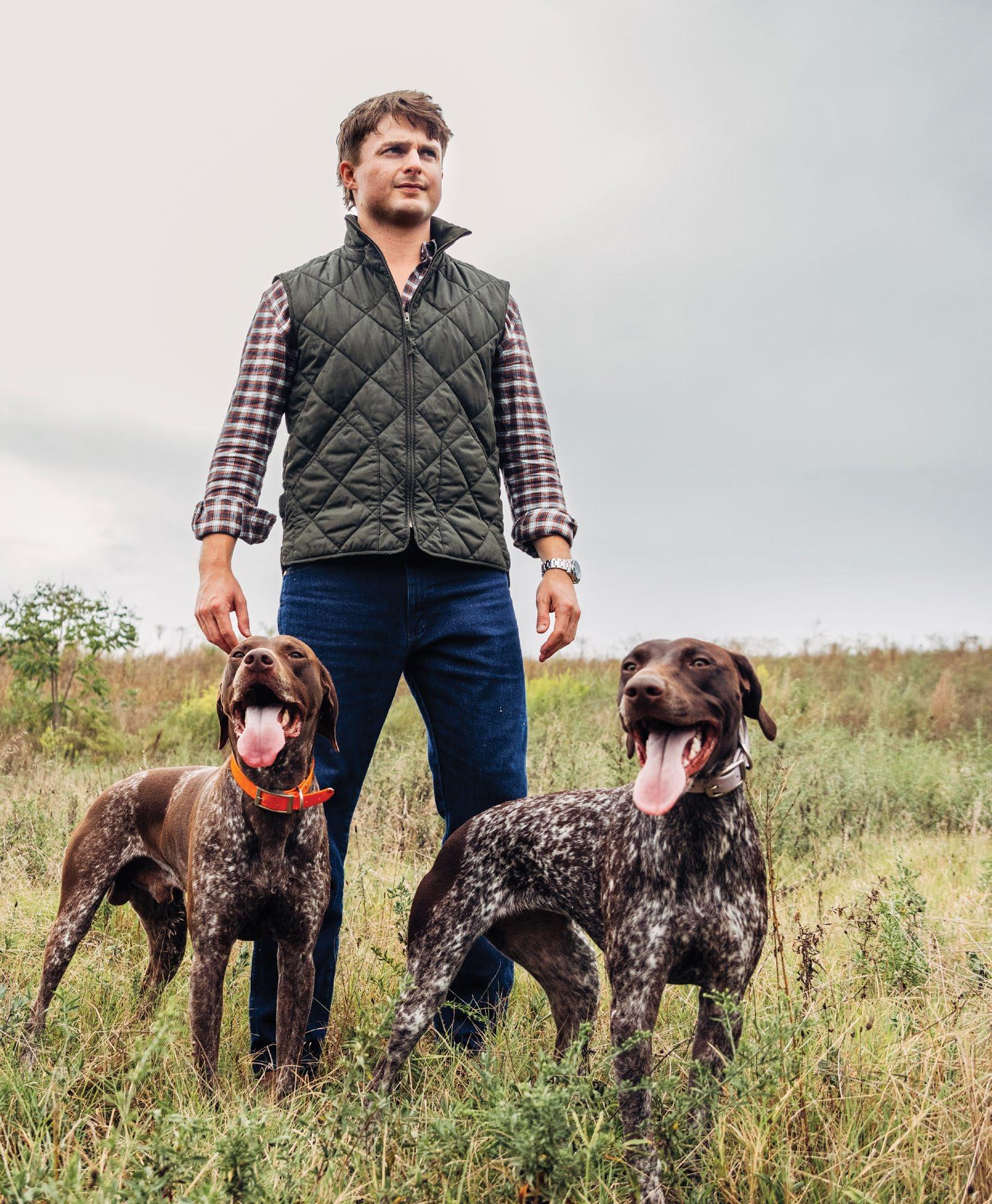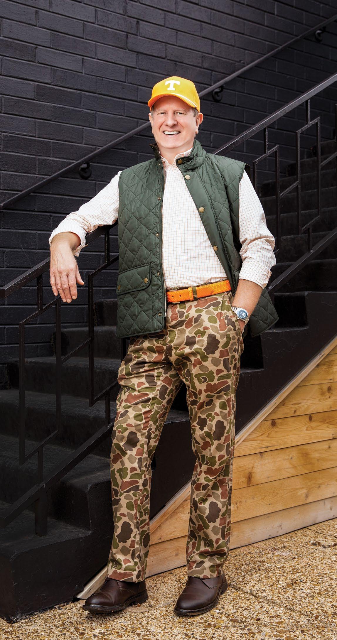 This elevated casual ensemble incorporates classic Southern elements. Chino pants in a camouflage pattern introduce interest while a dark sage green, diamond-quilted vest adds dimension. Departing from these earthy tones are pops of vibrant orange in Gerry’s checked shirt and accompanying accessories, which announce team spirit in style.
