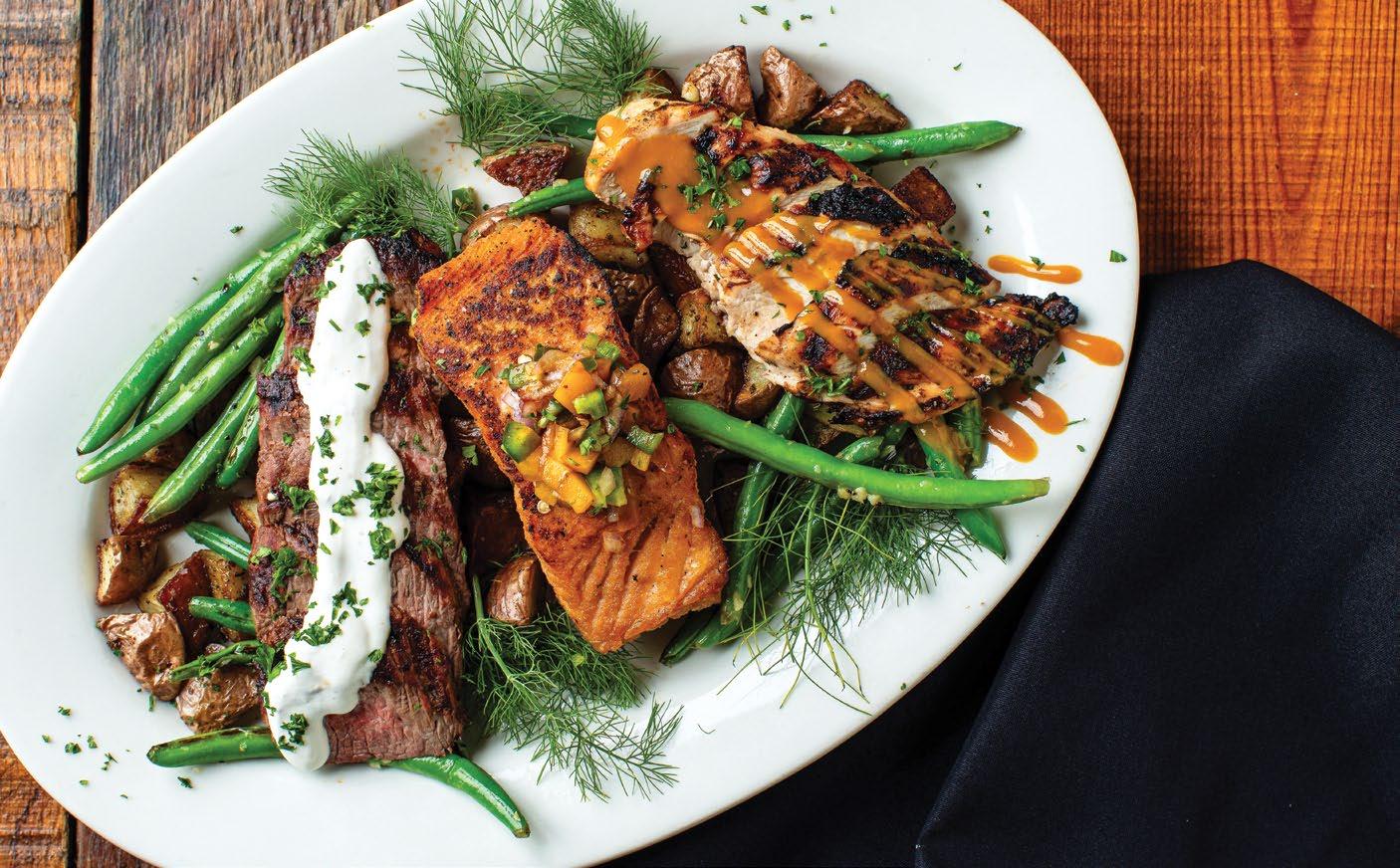 (left to right) Aji Shrimp Bowl Parilla-grilled shrimp, steamed rice, avocado, tomatoes, grilled peppers & onions, cilantro, kiwichi, Aji verde sauce. Butcher’s Butter Steak Eight-ounce wood-fired ribeye cap steak, Confusion potatoes, asparagus. Aji Amarillo Tuna Tacos Wonton taco shells, guacamole, shredded lettuce, Aji Amarillo, red onion, aji peppers, citrus blend, Tiger’s Milk, puffed kiwichi.