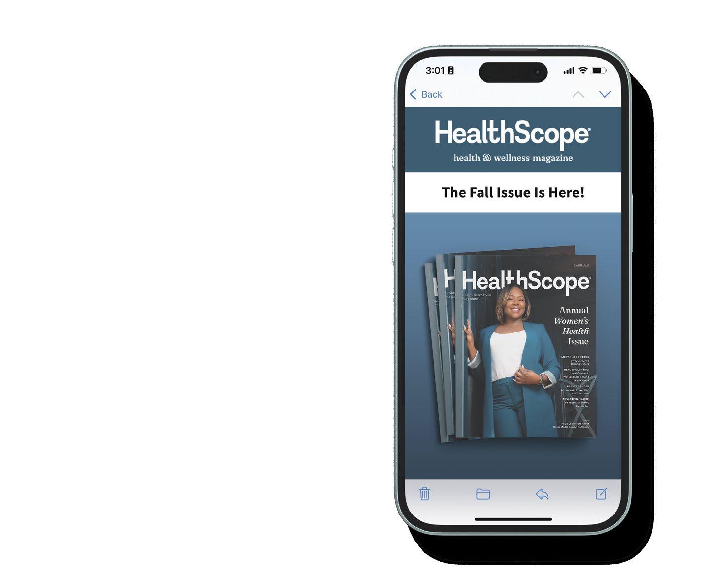 We hope this issue serves as a gentle reminder that prioritizing yourself is not selfish, but rather crucial. You can’t put oxygen masks on those around you if you yourself are running out of air. So, schedule the massage, make the appointments, and while you’re in the waiting room, pick up and enjoy a copy of HealthScope® magazine’s Annual Women’s Health Issue.