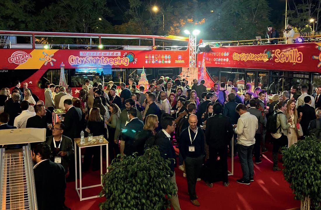 1 Meeting at the City Sightseeing stand at World Travel Market London 2022. 2 After TIS party outside Fibes exhibition centre in Seville. 3 City Sightseeing stand at TIS Global Summit.