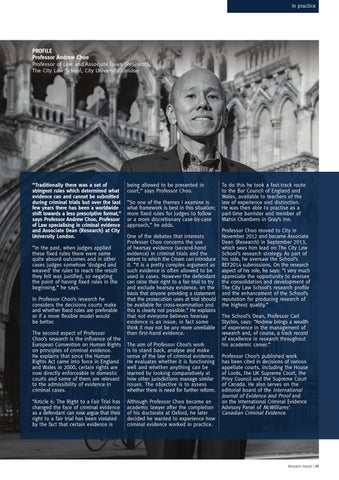 being allowed to be presented in court,” says Professor Choo. “So one of the themes I examine is what framework is best in this situation; more fixed rules for judges to follow or a more discretionary case-by-case approach,” he adds. One of the debates that interests Professor Choo concerns the use of hearsay evidence (second-hand evidence) in criminal trials and the extent to which the Crown can introduce it. “It is a pretty complex argument as such evidence is often allowed to be used in cases. However the defendant can raise their right to a fair trial to try and exclude hearsay evidence, on the basis that anyone providing a statement that the prosecution uses at trial should be available for cross-examination and this is clearly not possible.” He explains that not everyone believes hearsay evidence is an issue; in fact some think it may not be any more unreliable than first-hand evidence. The aim of Professor Choo’s work is to stand back, analyse and make sense of the law of criminal evidence. He evaluates whether it is functioning well and whether anything can be learned by looking comparatively at how other jurisdictions manage similar issues. The objective is to assess whether there is need for further reform. Although Professor Choo became an academic lawyer after the completion of his doctorate at Oxford, he later decided he wanted to experience how criminal evidence worked in practice.