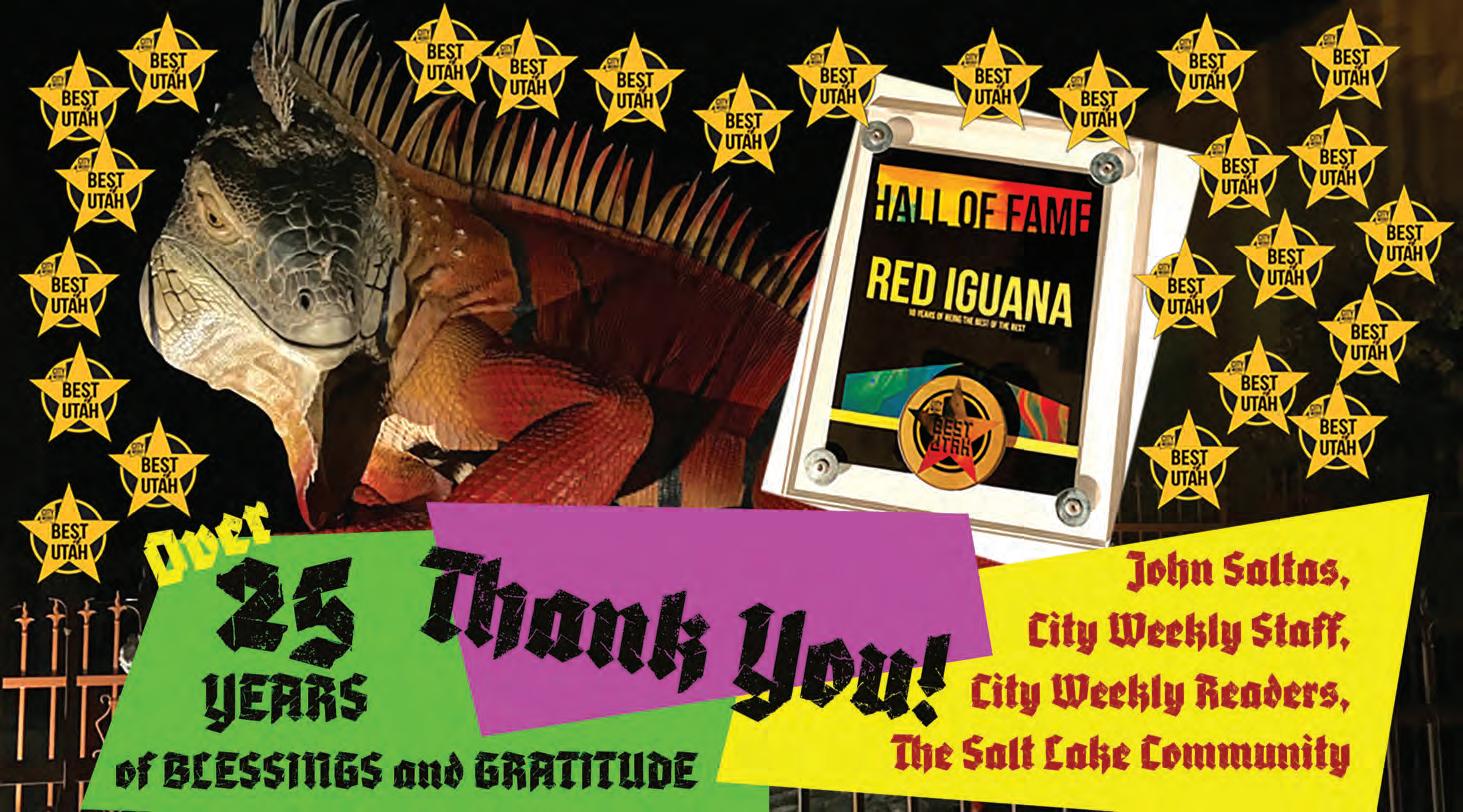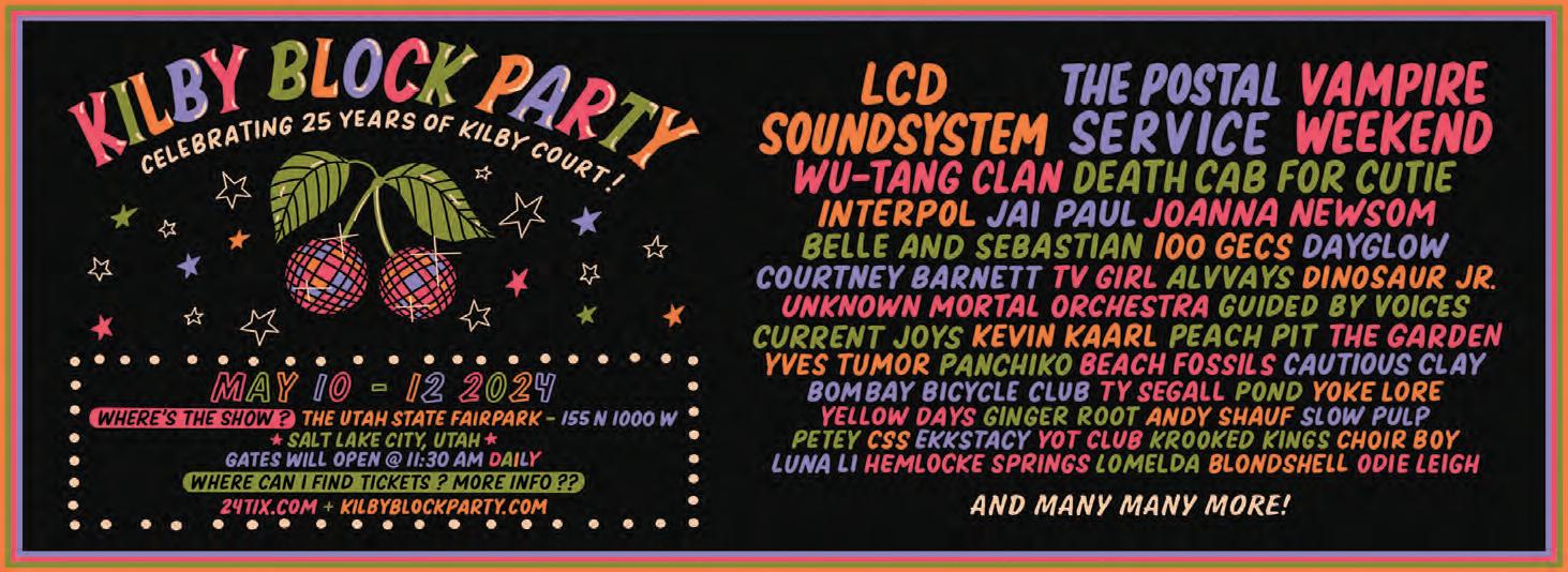 55°/43° Light rain Precipitation: 69% Sunday 28 62°/46° Partly cloudy Precipitation: 18% Monday 29 69°/49° Partly cloudy Precipitation: 7% Tuesday 30 70°/50° Mostly sunny Precipitation: 3% Wednesday 1 73°/51° Partly cloudy Precipitation: 8% SOURCE: WEATHER.COM CONTENTS CW salt lake 6 OPINION 9 C W REWIND 10 A&E 37 CINEMA 38 MUSIC 45 C OMMUNITY Salt Lake City Weekly is published every Thursday by Copperfield Publishing Inc. We are an independent publication dedicated to alternative news and news sources, that also serves as a comprehensive entertainment guide. 16,000 copies of Salt Lake City Weekly are available free of charge at more than 1,000 locations along the Wasatch Front. Limit one copy per reader. Additional copies of the paper can be purchased for $1 (Best of Utah and other special issues, $5) payable to Salt Lake City Weekly in advance. No person, without expressed permission of Copperfield Publishing Inc., may take more than one copy of any Salt Lake City Weekly issue. No portion of this publication may be reproduced in whole or part by any means, including electronic retrieval systems, without the written permission of the publisher. Third-class postage paid at Midvale, UT. Delivery might take up to one full week. All rights reserved. Phone 801-654-1393 | Email comments@cityweekly.net Office address : 75 E. 400 South, Ste. 204, Salt Lake City, UT 84111 PRINTED ON RECYCLED PAPER STAFF All Contents © 2024 City Weekly is Registered with the U.S. Patent and Trademark Office Copperfield Publishing Inc. | John Saltas, City Weekly founder Publisher PETE SALTAS News Editor BENJAMIN WOOD Arts & Entertainment Editor SCOTT RENSHAW Contributing Editor JERRE WROBLE Music Editor EMILEE ATKINSON Listings Desk WES LONG Executive Editor and Founder JOHN SALTAS Circulation Manager ERIC GRANATO Associate Business Manager PAULA SALTAS Technical Director BRYAN MANNOS Developer BRYAN BALE Senior Account Executive DOUG KRUITHOF Account Executives KELLY BOYCE, KAYLA DREHER, KRISTA MAGGARD D isplay Advertising 801-654-1393 National Advertising VMG Advertising | 888-278-9866 Editorial Contributors KATHARINE BIELE, ROB BREZSNY, SOPHIE CALIGIURI, AIMEE L. COOK, MARK DAGO, ERIN MOORE, MIKE RIEDEL, ARICA ROBERTS, AMANDA ROCK, CHRISTOPHER SMART, ALEX SPRINGER, LILY SPRINGER, L EE ZIMMERMAN Graphic Artists SOFIA CIFUENTES, CHELSEA NEIDER listen on demand