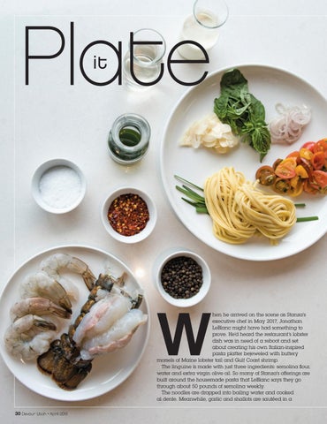 hen he arrived on the scene as Stanza’s executive chef in May 2017, Jonathan LeBlanc might have had something to prove. He’d heard the restaurant’s lobster dish was in need of a reboot and set about creating his own Italian-inspired pasta platter bejeweled with buttery morsels of Maine lobster tail and Gulf Coast shrimp. The linguine is made with just three ingredients: semolina flour, water and extra virgin olive oil. So many of Stanza’s offerings are built around the housemade pasta that LeBlanc says they go through about 50 pounds of semolina weekly. The noodles are dropped into boiling water and cooked al dente. Meanwhile, garlic and shallots are sautéed in a 30 Devour Utah • April 2018