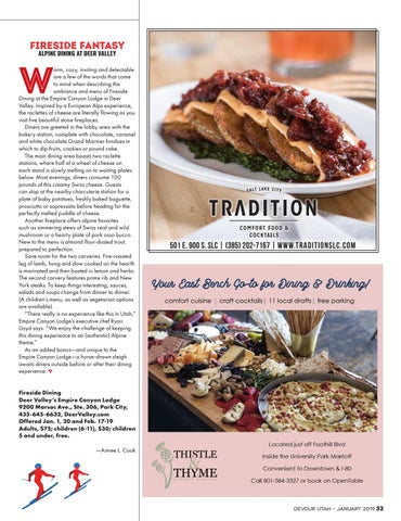 arm, cozy, inviting and delectable are a few of the words that come to mind when describing the ambiance and menu of Fireside Dining at the Empire Canyon Lodge in Deer Valley. Inspired by a European Alps experience, the raclettes of cheese are literally flowing as you visit five beautiful stone fireplaces. Diners are greeted in the lobby area with the bakery station, complete with chocolate, caramel and white chocolate Grand Marnier fondues in which to dip fruits, cookies or pound cake. The main dining area boasts two raclette stations, where half of a wheel of cheese on each stand is slowly melting on to waiting plates below. Most evenings, diners consume 100 pounds of this creamy Swiss cheese. Guests can stop at the nearby charcuterie station for a plate of baby potatoes, freshly baked baguette, prosciutto or sopressata before heading for the perfectly melted puddle of cheese. Another fireplace offers alpine favorites such as simmering stews of Swiss veal and wild mushroom or a hearty plate of pork osso bucco. New to the menu is almond flour-dusted trout, prepared to perfection. Save room for the two carveries. Fire-roasted leg of lamb, hung and slow cooked on the hearth is marinated and then basted in lemon and herbs. The second carvery features prime rib and New York steaks. To keep things interesting, sauces, salads and soups change from dinner to dinner. (A children’s menu, as well as vegetarian options are available). “There really is no experience like this in Utah,” Empire Canyon Lodge’s executive chef Ryan Lloyd says. “We enjoy the challenge of keeping this dining experience to an (authentic) Alpine theme.” As an added bonus—and unique to the Empire Canyon Lodge—a horse-drawn sleigh awaits diners outside before or after their dining experience. ❖