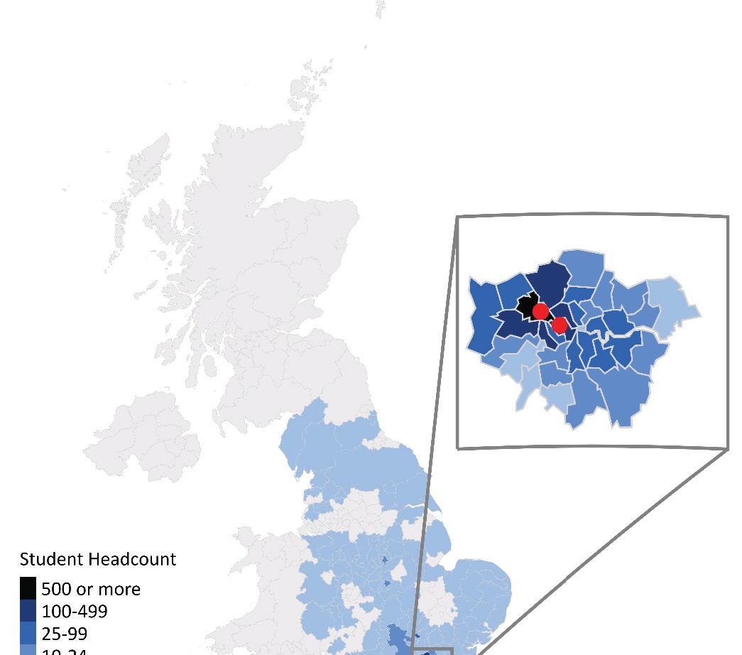 The direct impact of the College’s physical footprint was based on its operating and capital expenditures, standing at £59 million in 2023-24 (including £51 million of operating expenditure5 and £8 million of capital expenditure). We then assessed the indirect and induced economic impacts associated with UCG’s expenditures, using economic multipliers derived from a (multi-regional) Input-output model. These effects capture the additional rounds of spending throughout the economy that are generated by the College’s expenditures (through the College’s supply chain and the spending of its staff). Applying relevant economic multipliers, the total direct, indirect, and induced impact associated with the College’s expenditures in the 2023-24 academic year was estimated at £118 million (see Figure 1). The majority of this impact (£100 million, 84%) occurred in London (including £54 million in Inner West London and £34 million in Outer West and North West London6). The remainder (£19 million, 16%) was accrued across the rest of the UK.