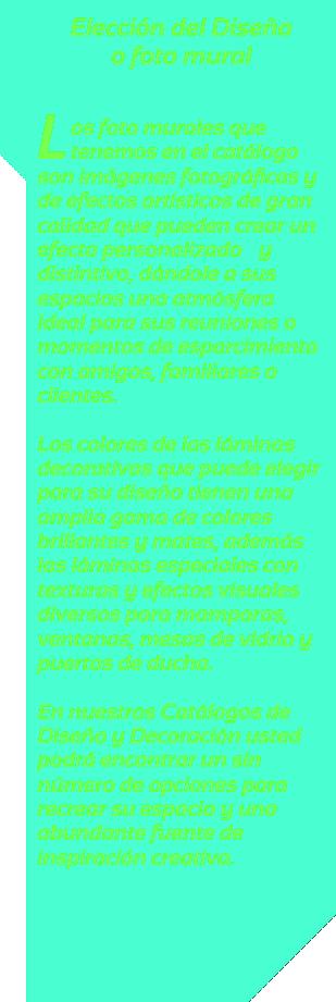 murales. Diseñamos, imprimimos e instalamos imágenes de calidad para decorar salas, habitaciones personales, salones de reunión, lobby`s, recepciones en casas u oficinas, stands de exposiciones, publicidad interior y exterior. Contamos con un banco de variadas imágenes.