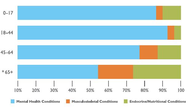 For all age groups except people over 65+, 75% of all telehealth visits were for MH