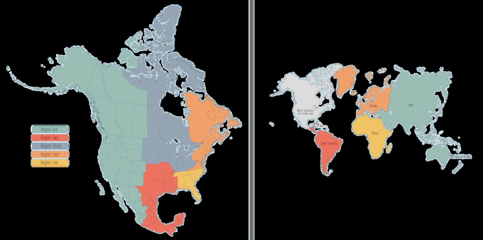 This map shows how states and countries are divided into the five CIVSA regions.