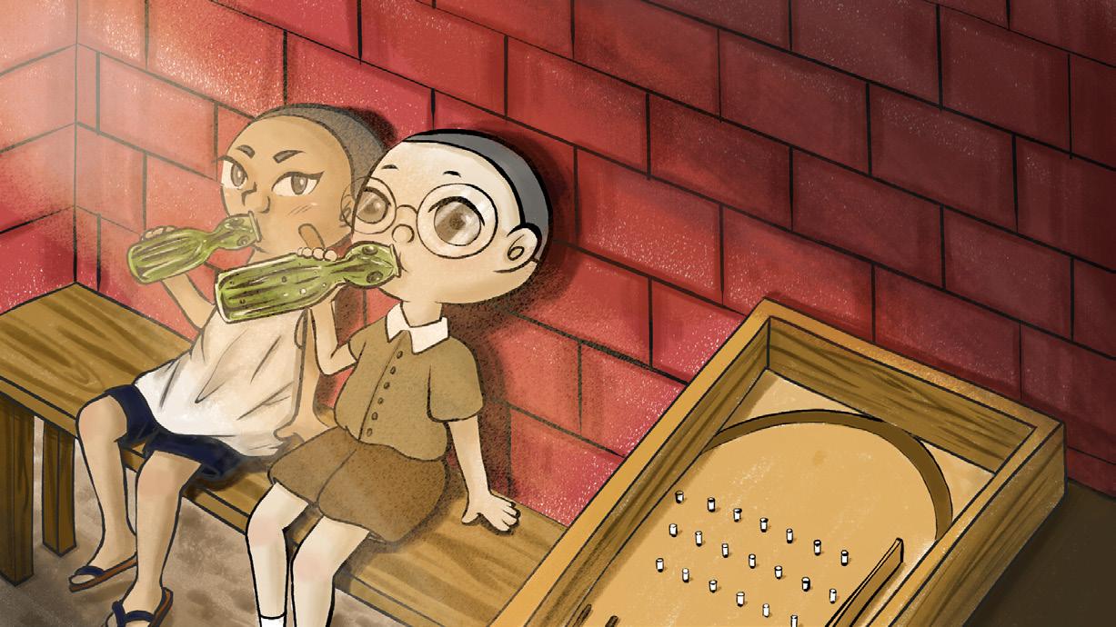 彈珠汽水是由日本傳入臺灣的一種碳酸飲料,立樹喝到家鄉盛行 的汽水感到安心,看到一旁的彈珠台一直盯著看,原來因為藤野 家的父親管教嚴格,立樹從沒接觸過這類的遊戲而感到好奇。楊 太靠上向立樹示範彈珠台怎麼玩,立樹看著彈珠在裡面彈跳不禁 躍躍欲試,也開始玩起彈珠台。