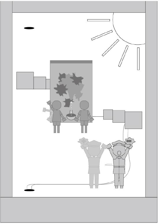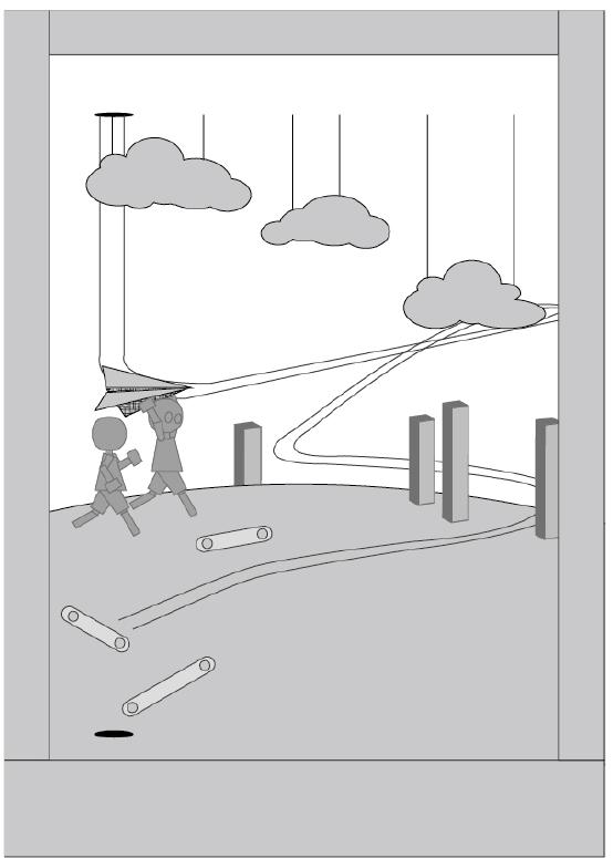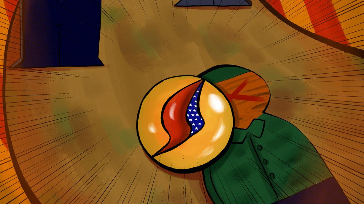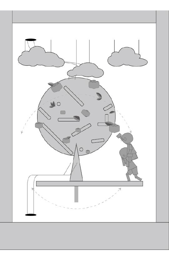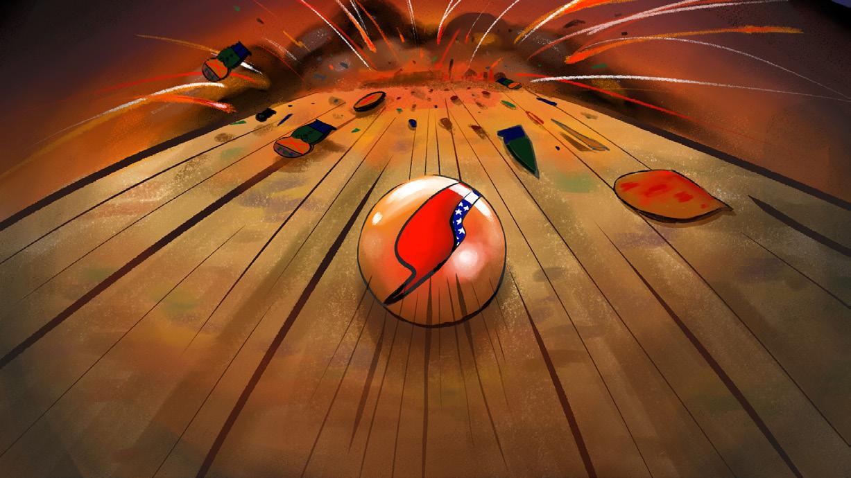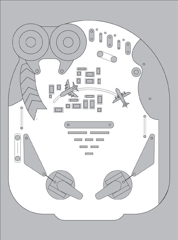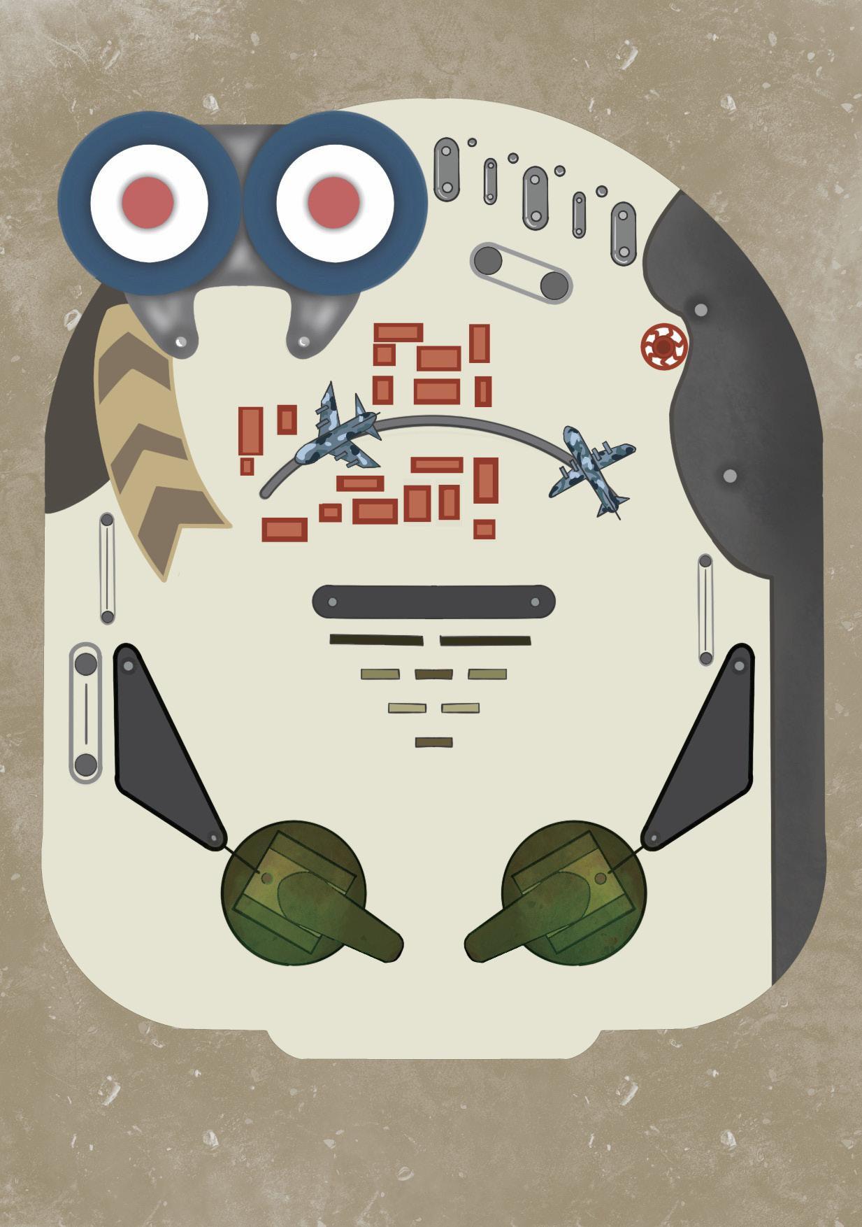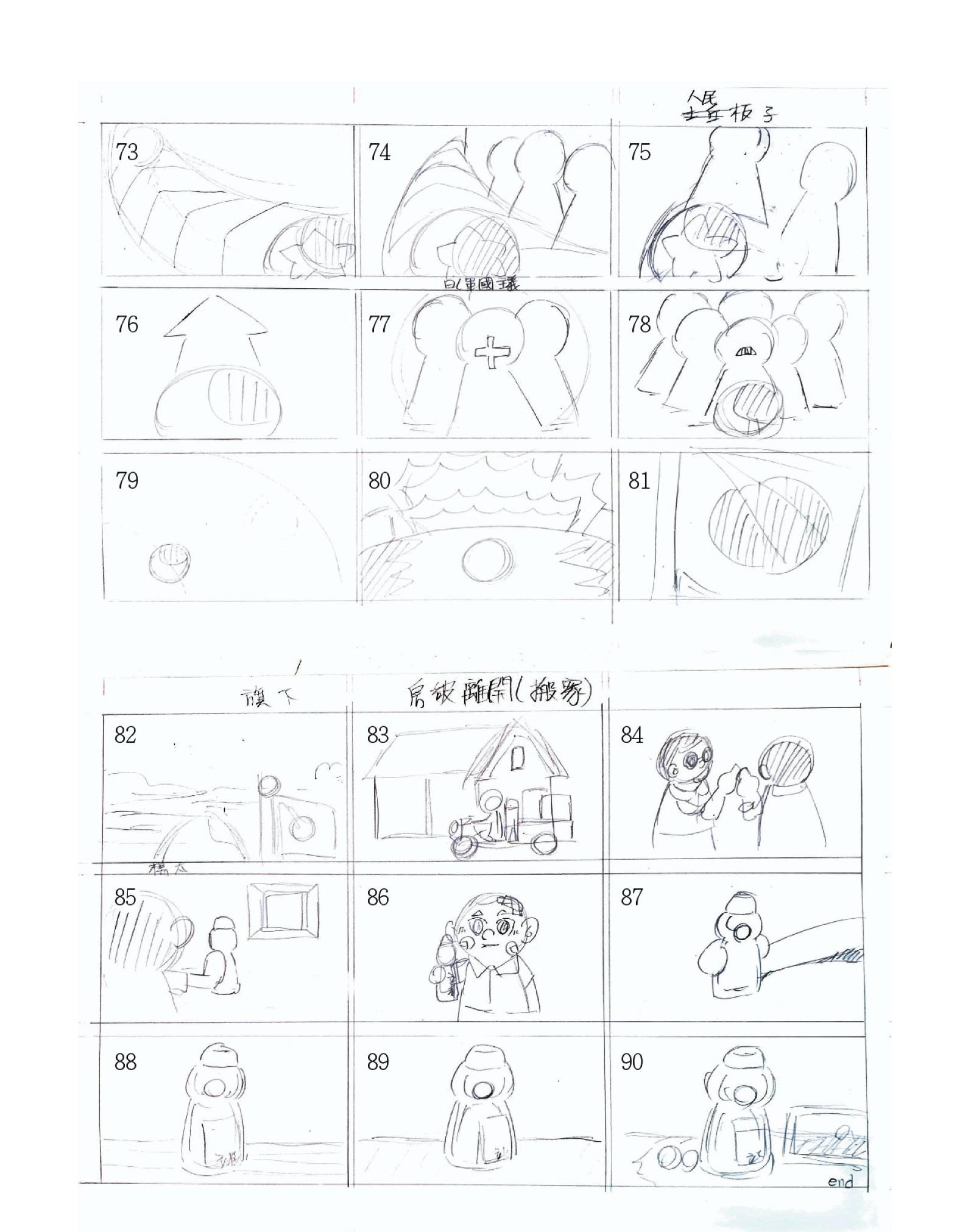 駐軍在臺灣的日軍向美軍發起攻勢開大砲,彈珠往轟炸機的方 向直面而來,彈珠的撞擊導致轟炸機失靈。來到在日本的主戰 場,美軍派出轟炸機向日本投下彈珠,彈珠衝進日本的軍事基 地一一打趴裡頭的士兵,彈珠繼續衝往建築群,建築群像骨牌 般倒塌後發生爆炸,上方騰起的蘑菇雲,彈珠直直向下滾落。
