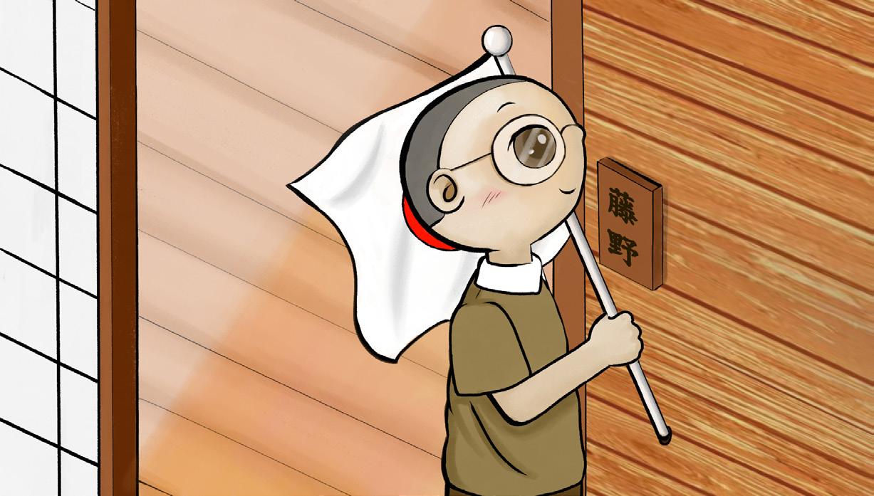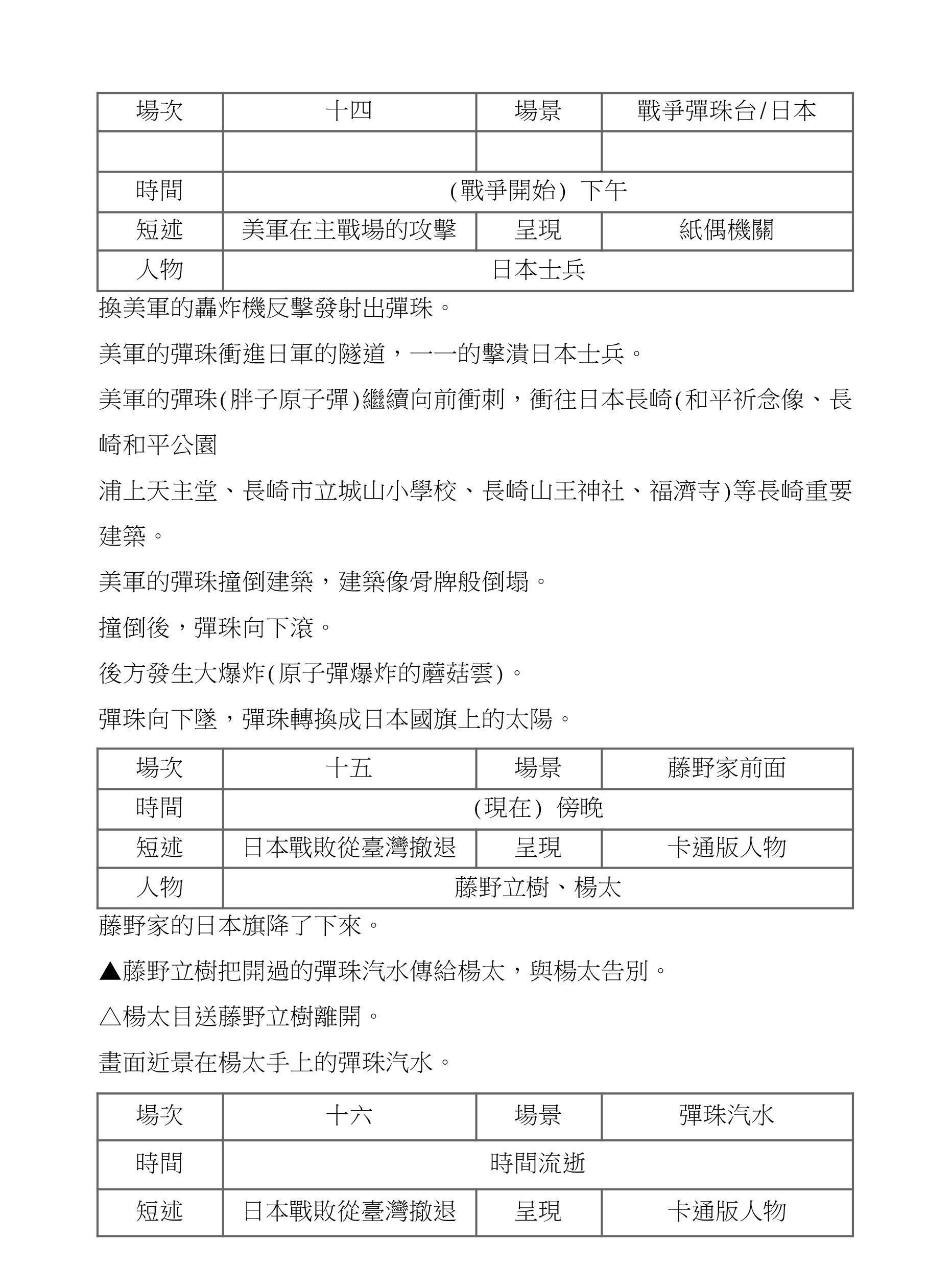 向下滾落的彈珠,變成日本國旗上的紅色太陽,藤野家的國旗降 了下來,原來因為日本與美國之間的戰爭,日本戰敗了所以一家 人要從臺灣撤離回日本。立樹拿起手上開好的彈珠汽水遞給楊太 向他告別,楊太手上拿著彈珠汽水望向往遠方行駛的藤野一家。