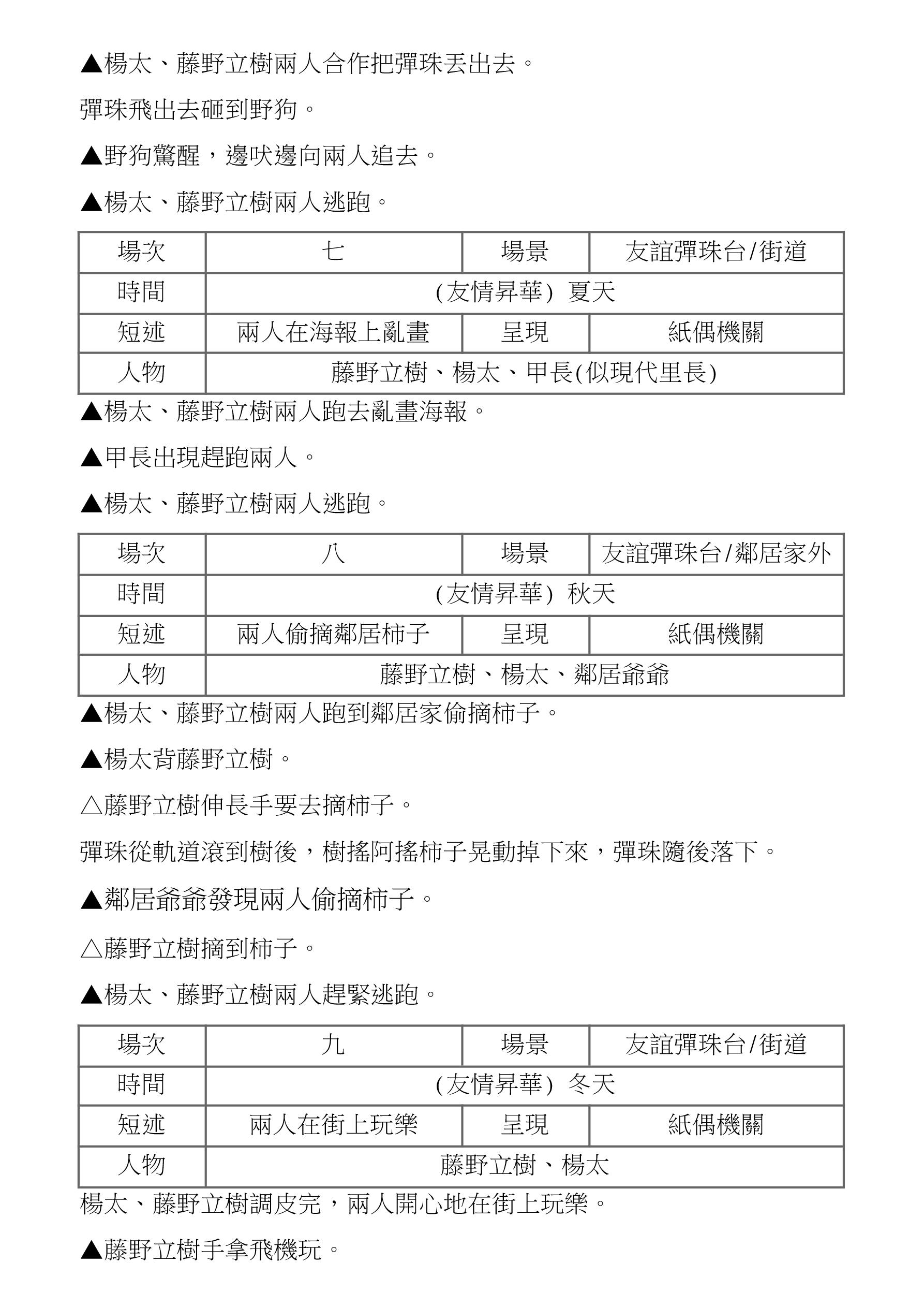 故事來到隔天,立樹在書房裡認真讀書,楊太找上門邀請立樹出 門玩,兩人走在街上看到昨天欺負立樹的野狗,決定向野狗復仇 卻失敗反被野狗追,兩人趕緊逃跑;夏天到來,變得更加熟識的 楊太與立樹在警察大人的海報上塗鴉,被巡邏的甲長發現,兩人 趕緊逃跑;到了秋天,鄰居家的柿子樹結了果實,楊太背起立樹 準備偷摘柿子,被鄰居爺爺發現,兩人趕緊摘了柿子就跑;冬天 來臨,在街上立樹拿著飛機、楊太拿著彈珠,兩人邊走邊玩,突 然響起空襲警報,彈珠一落回到雜貨店。