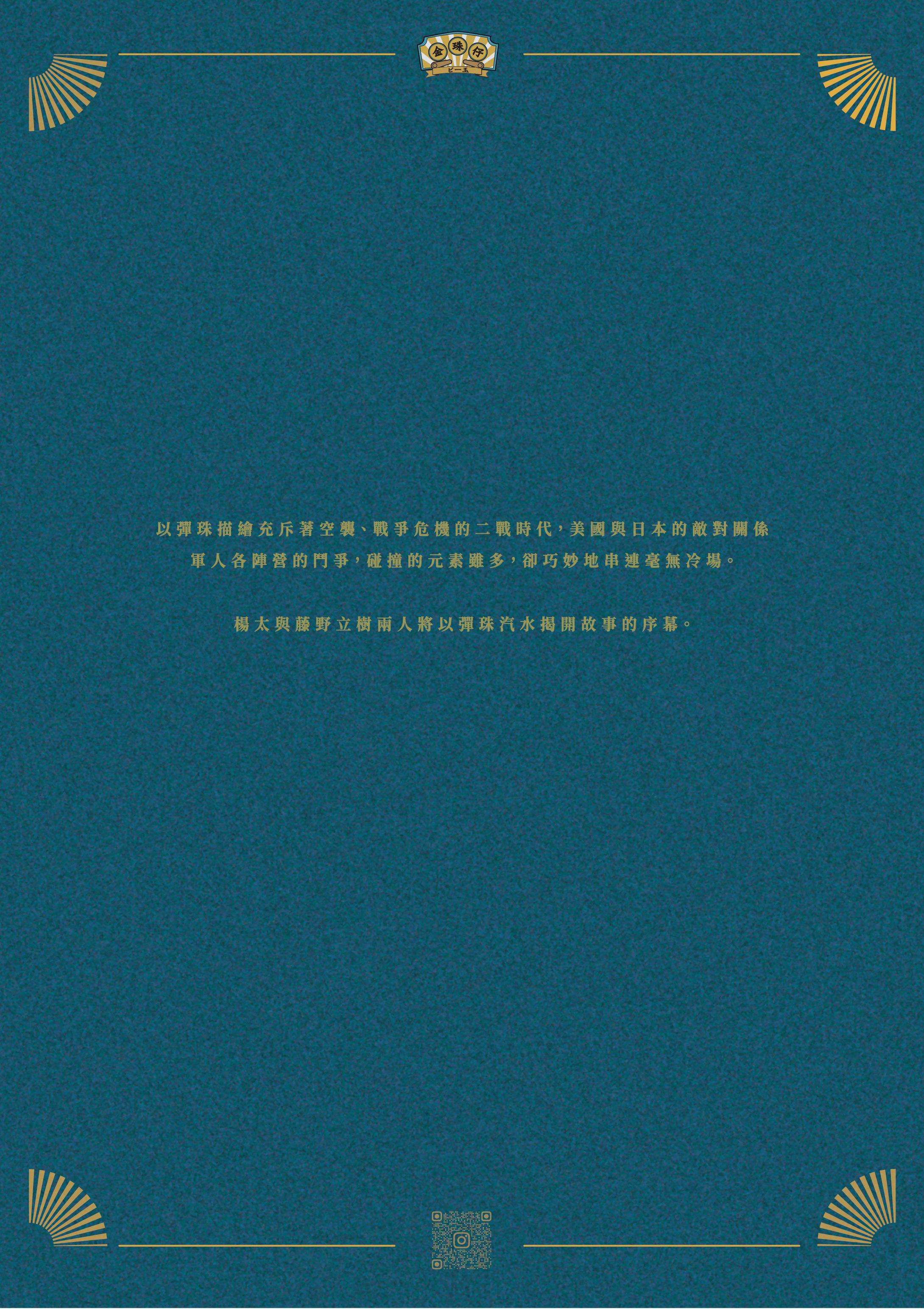 的臺灣,主角兩人藤野立樹與楊太間因彈珠汽水所結識的羈 絆,以彈珠描繪充斥著空襲、戰爭危機的二戰時代,內容提及 了美國與日本的敵對關係、軍人各陣營的鬥爭,碰撞的元素雖 多,卻巧妙地串連毫無冷場。